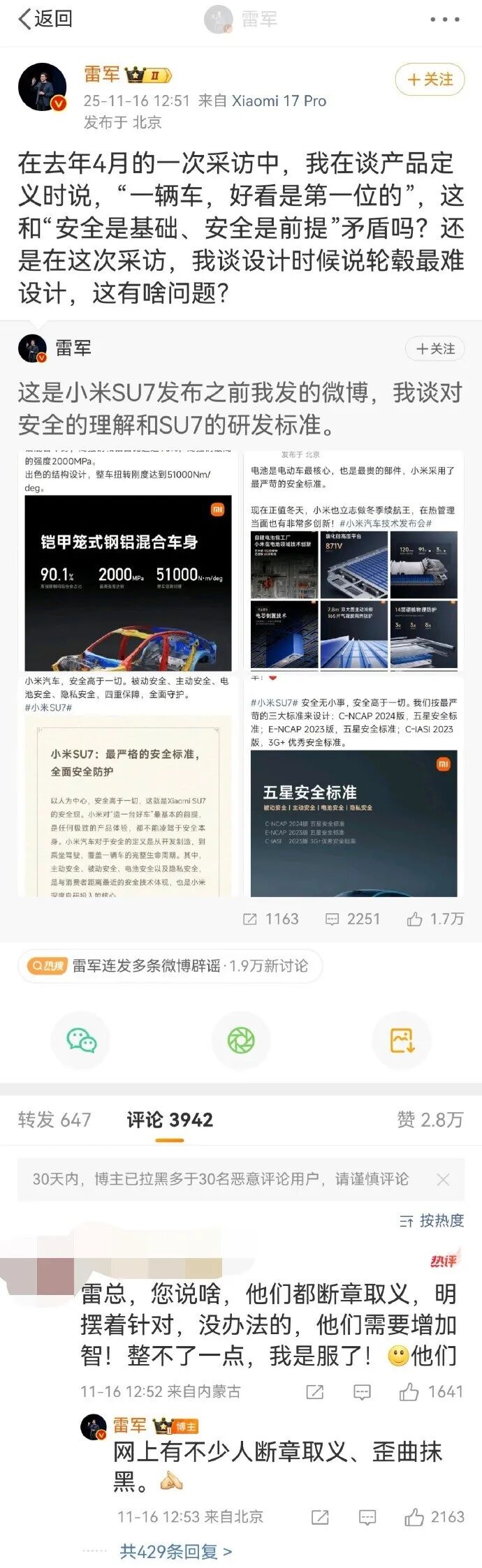 11月16日,小米创始人雷军一反常态,在微博上连续发声,回应有关小米汽车“重颜值、轻安全”的质疑。