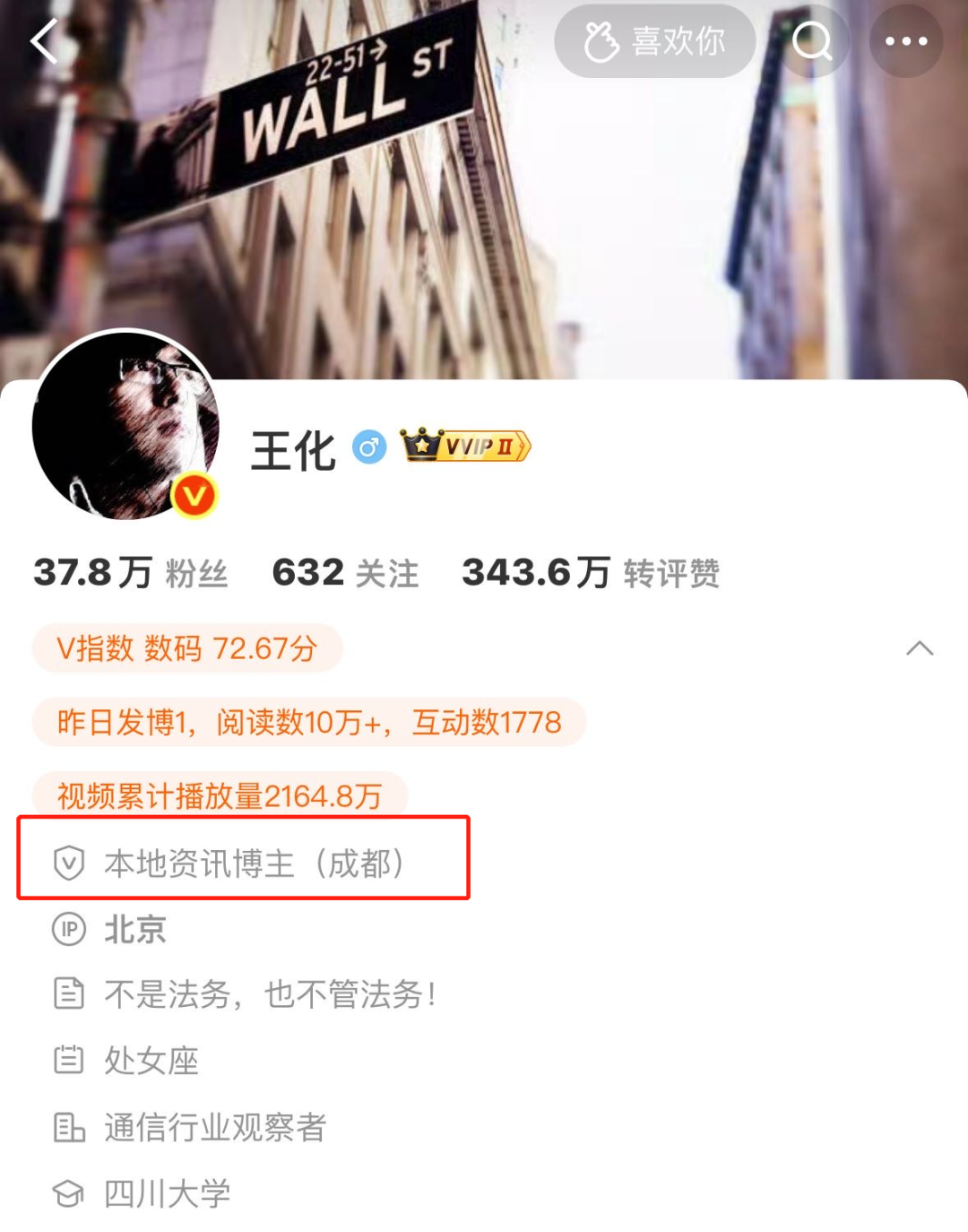 ▶ 图注:王化目前微博认证为“本地资讯博主(成都)”
