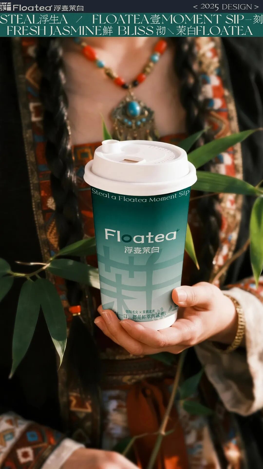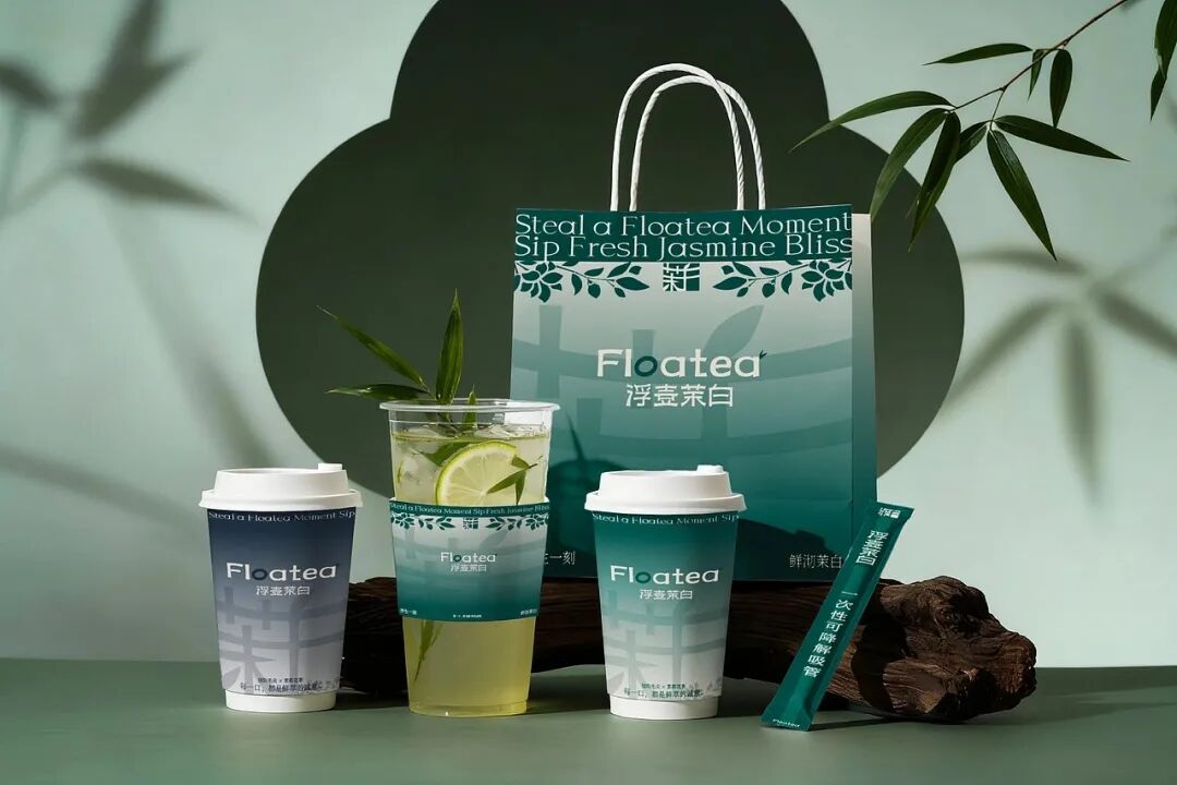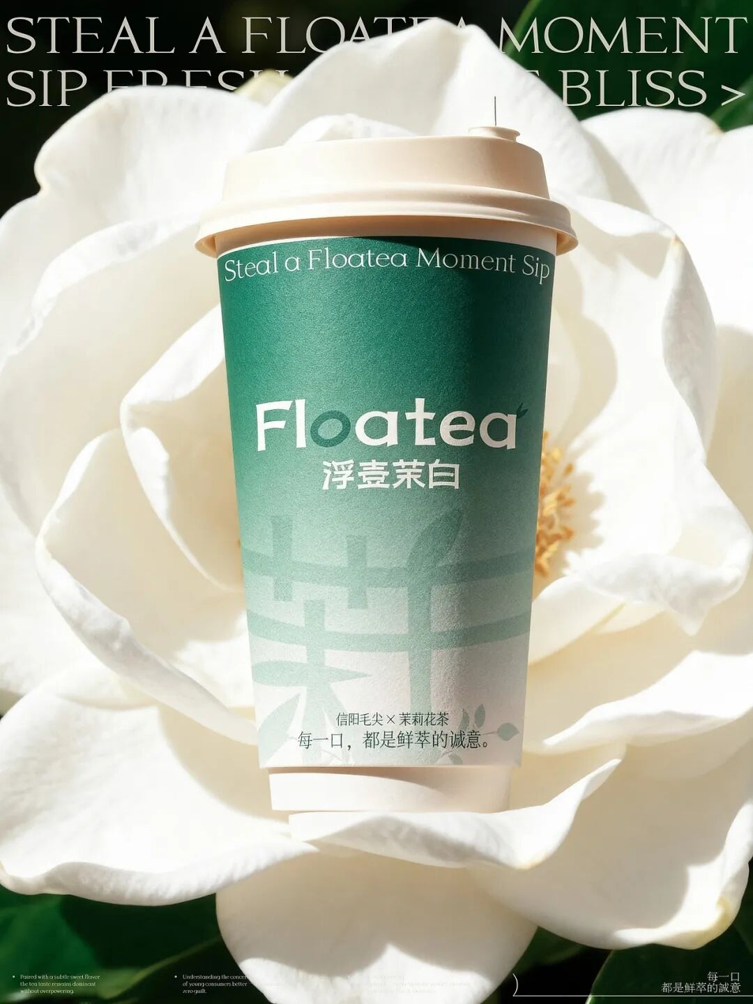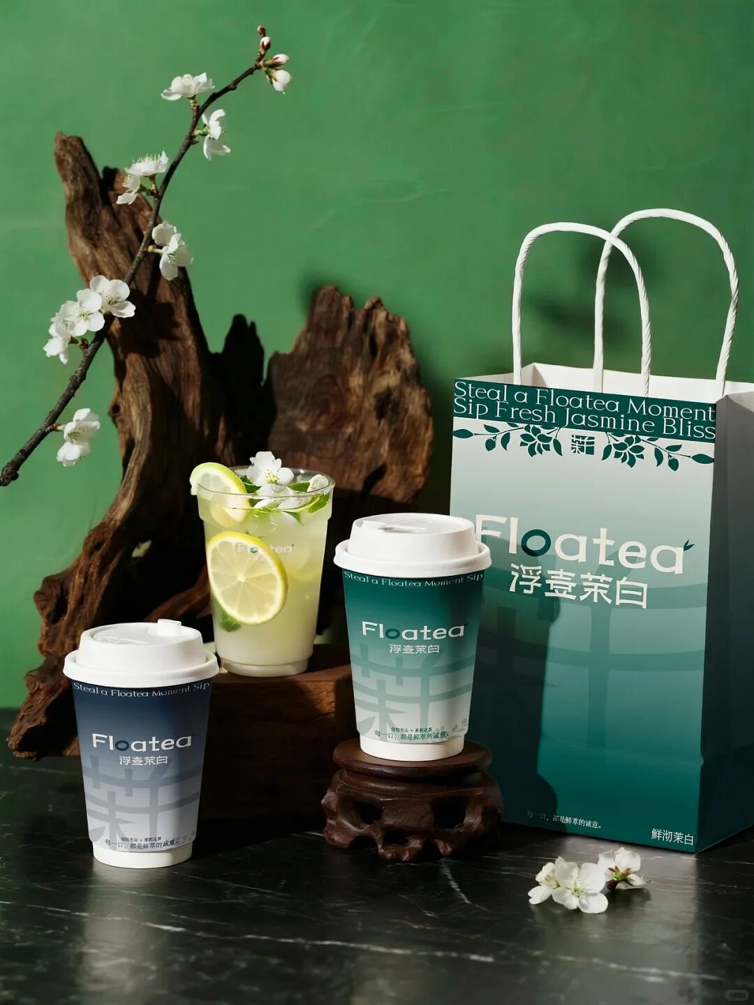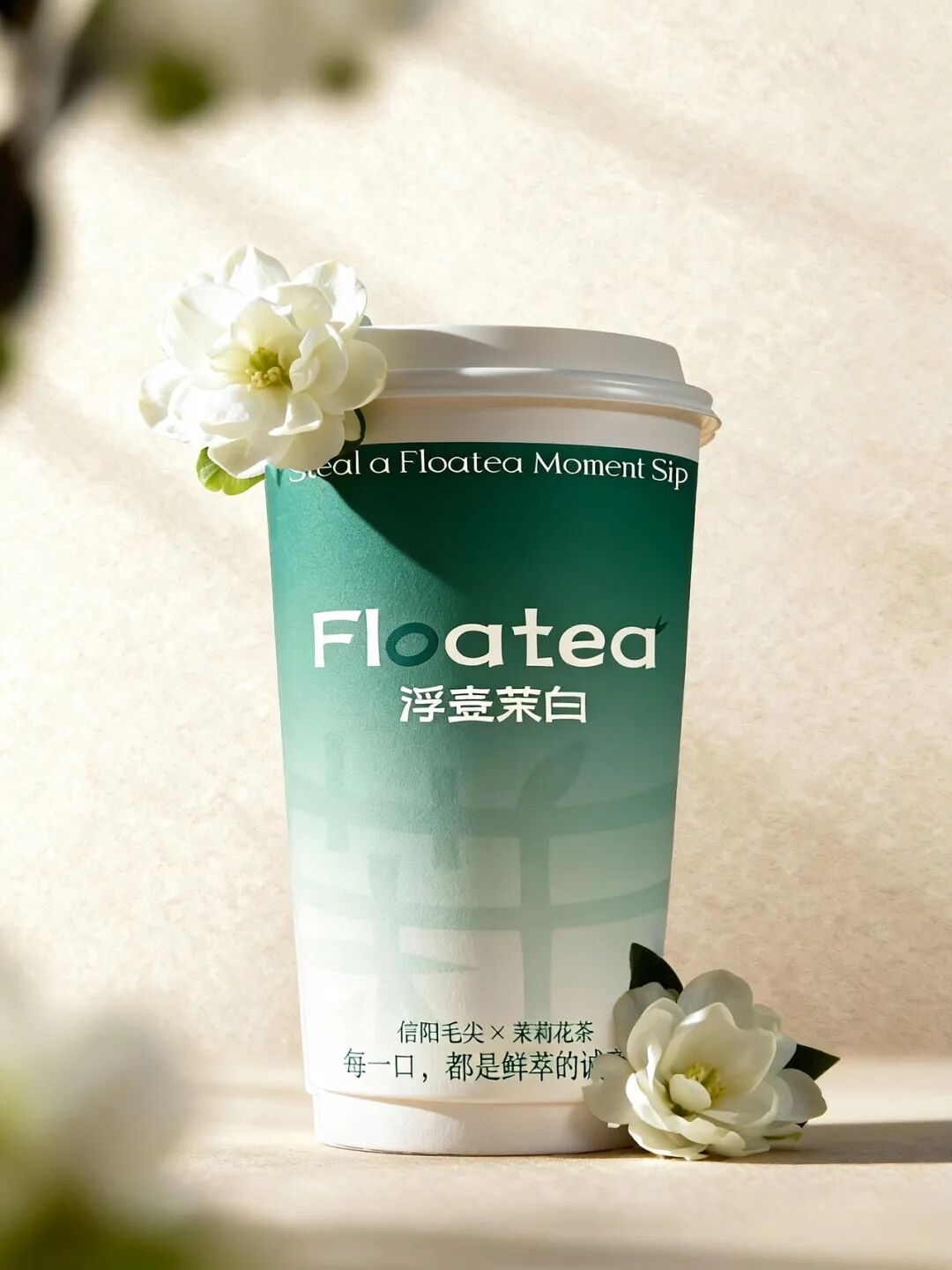 品牌命名中的“浮”呼应浮生的松弛感,“壹”代表对鲜萃诚意的专注与唯一,“茉白”则直指核心风味--茉莉的清雅与茶汤的澄澈。英文名Floatea将Float与Tea融合让东方意境与国际表达自然衔接。