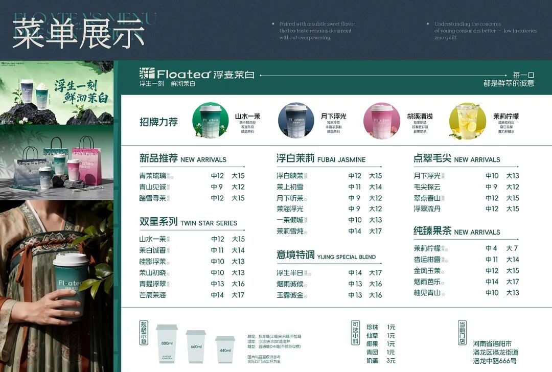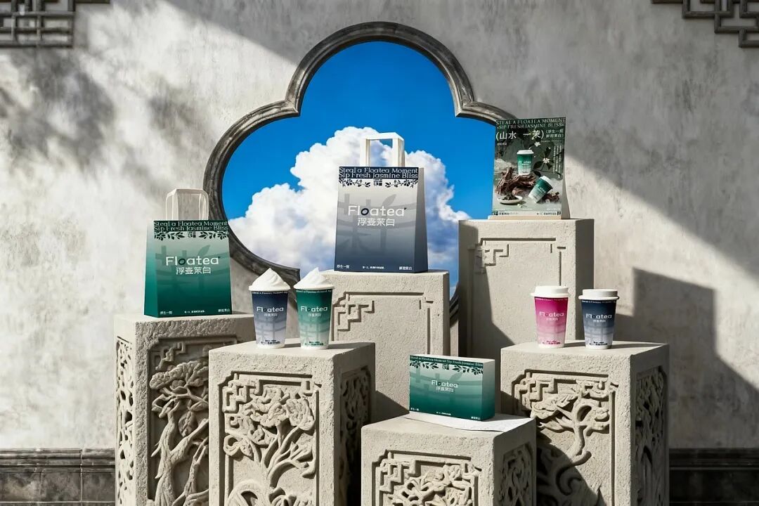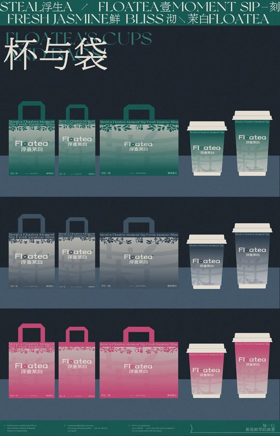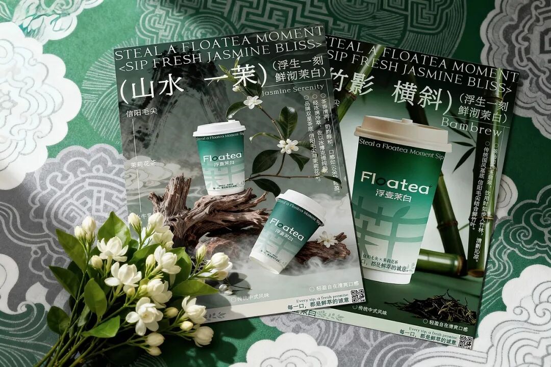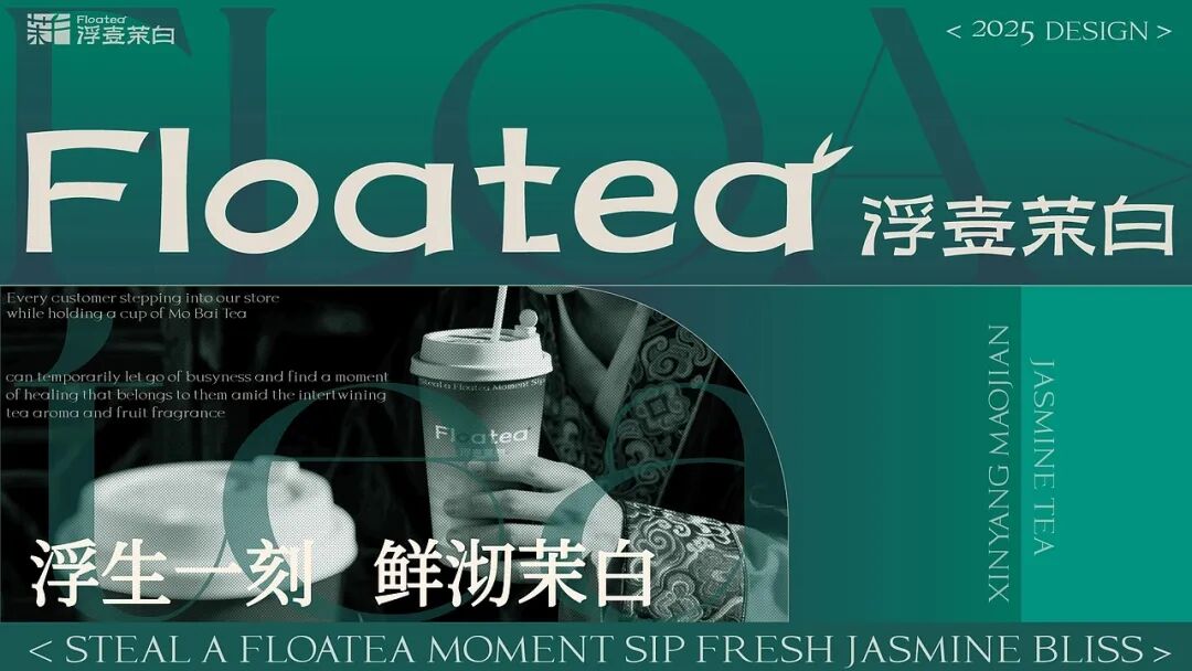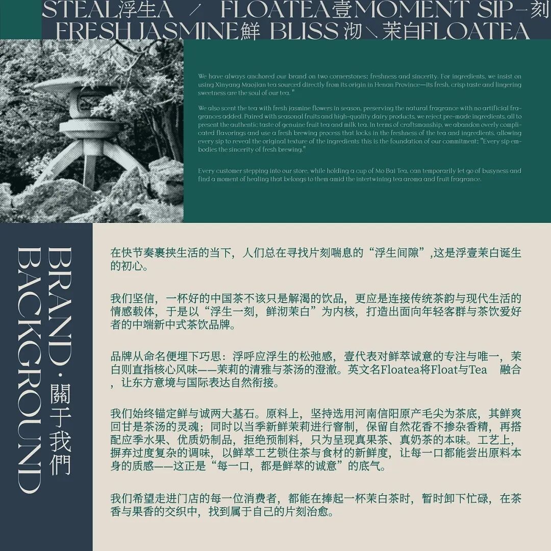 品牌命名中的“浮”呼应浮生的松弛感,“壹”代表对鲜萃诚意的专注与唯一,“茉白”则直指核心风味--茉莉的清雅与茶汤的澄澈。英文名Floatea将Float与Tea融合让东方意境与国际表达自然衔接。