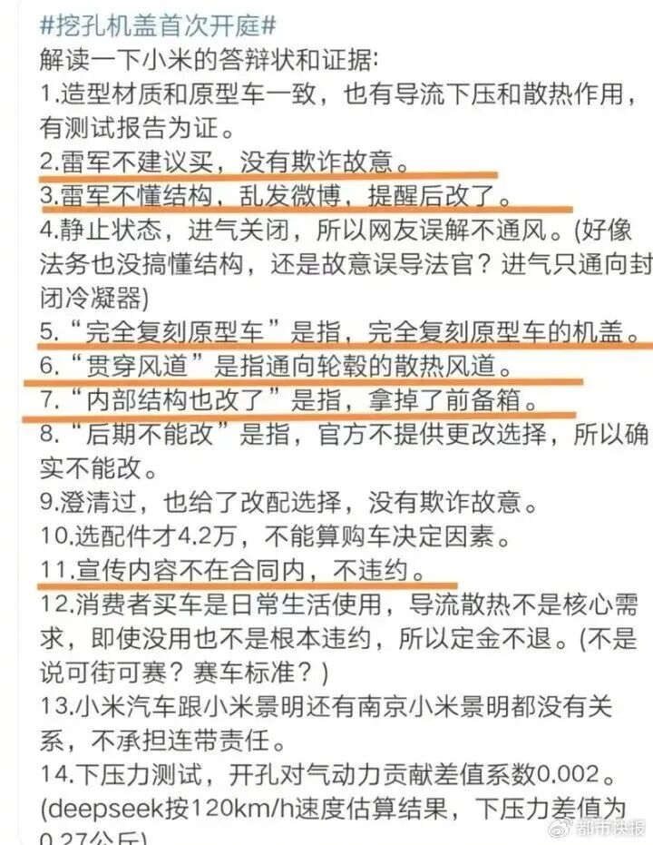 在部分SU7 Ultra车主因“碳纤维双风道前舱盖”涉嫌宣传与实物不符而提起的诉讼中,小米法务的辩护策略之一,竟是提出“雷军不懂结构”的说法。