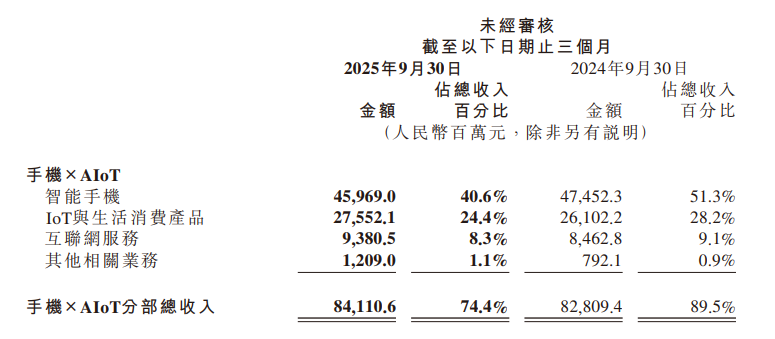 第三季度,智能手机收入为460亿元,同比小幅下滑3.1%。