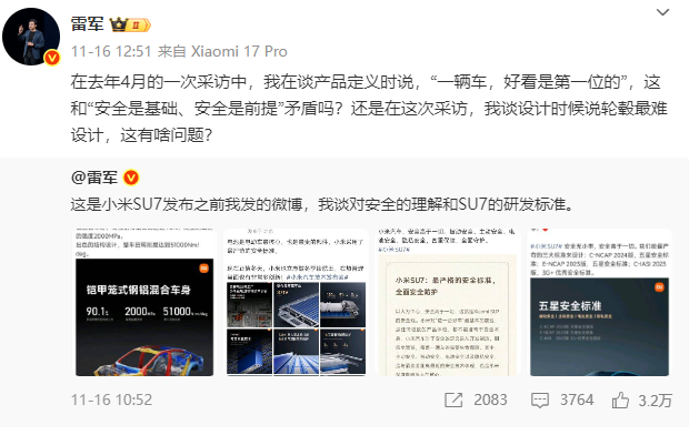 而雷军曾在2024年一次访谈中提到的“一辆车,好看是第一位的”这句话,被断章取义地广泛传播,与事故新闻交织,在舆论场中发酵成了“小米重颜值、轻安全”的尖锐指控。