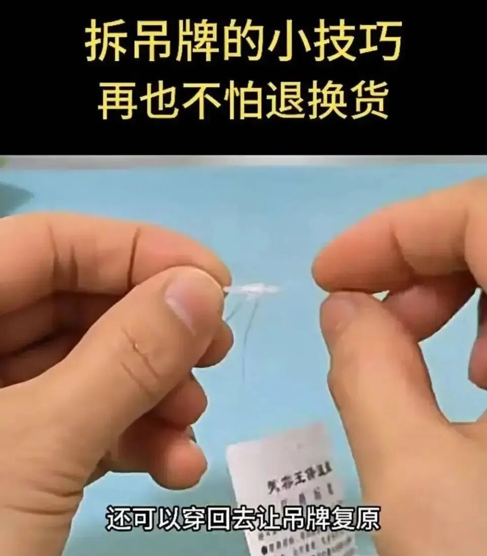 据悉,社交媒体上,还有人公开分享“拆吊牌小技巧,再也不怕退换货”的教程,教人们怎样无损拆吊牌后又恢复原样。