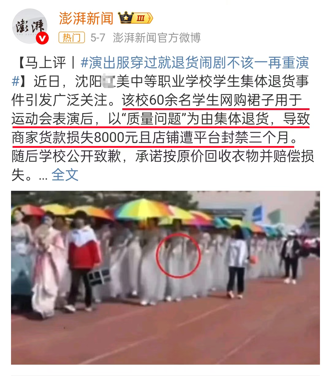 沈阳一职业技术学校网购白嫖演出服的事,大家应该都有所耳闻。