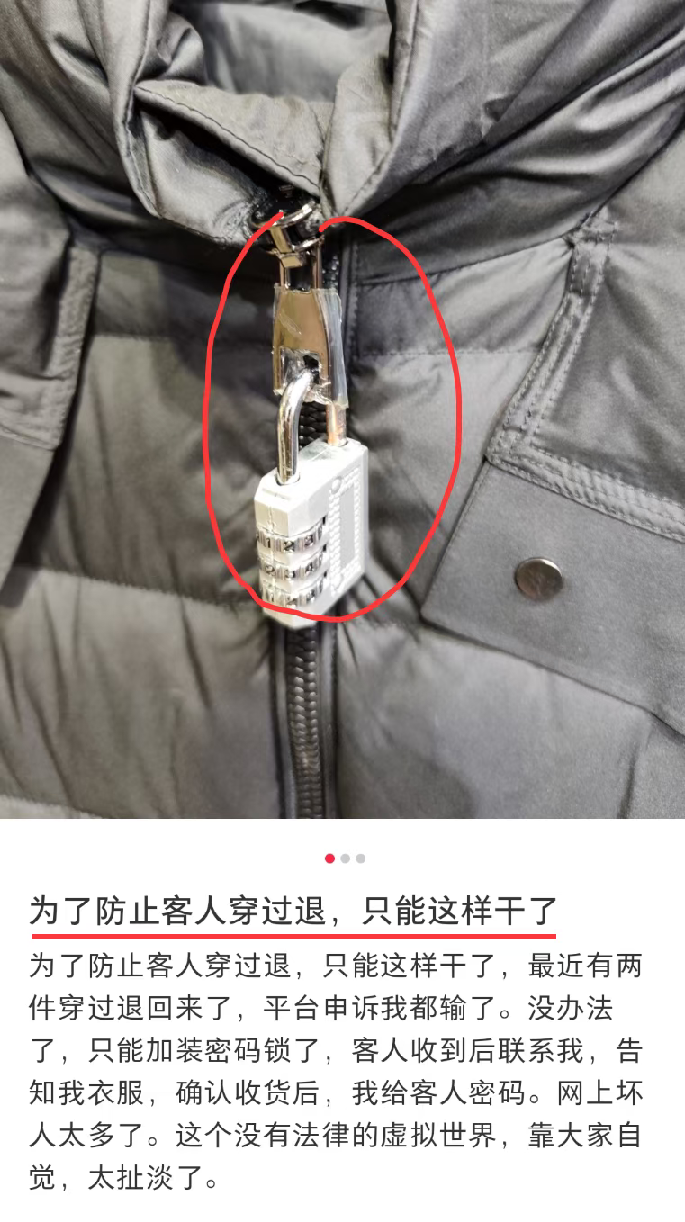 还有商家直接给羽绒服拉链挂上密码锁,不确认收货不给密码。