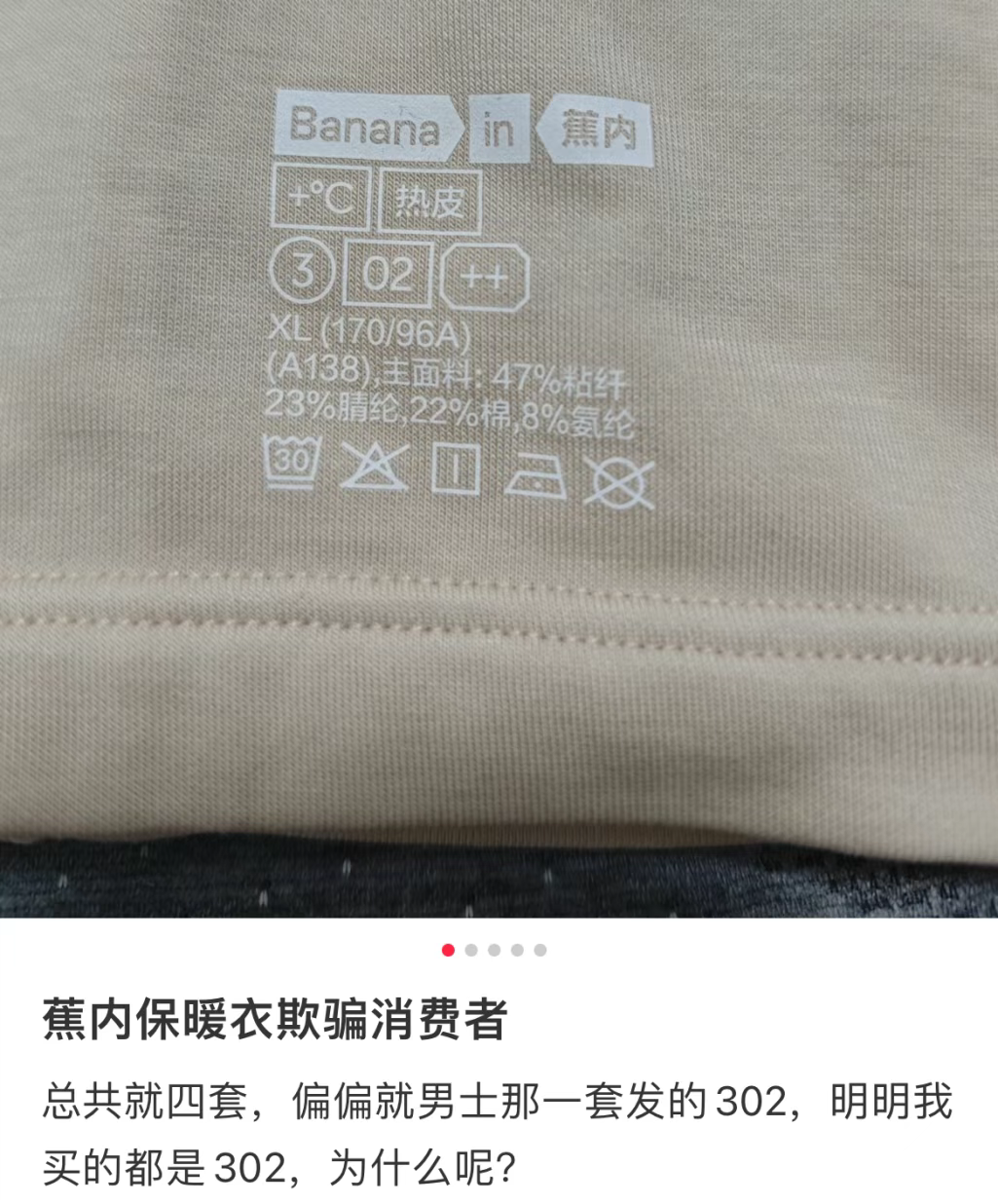 消费者发现,在李佳琦直播间买的女款热皮302保暖衣,实物成分和详情页说明不一致,和价格更低的301面料成分一样,可男款就没这问题。