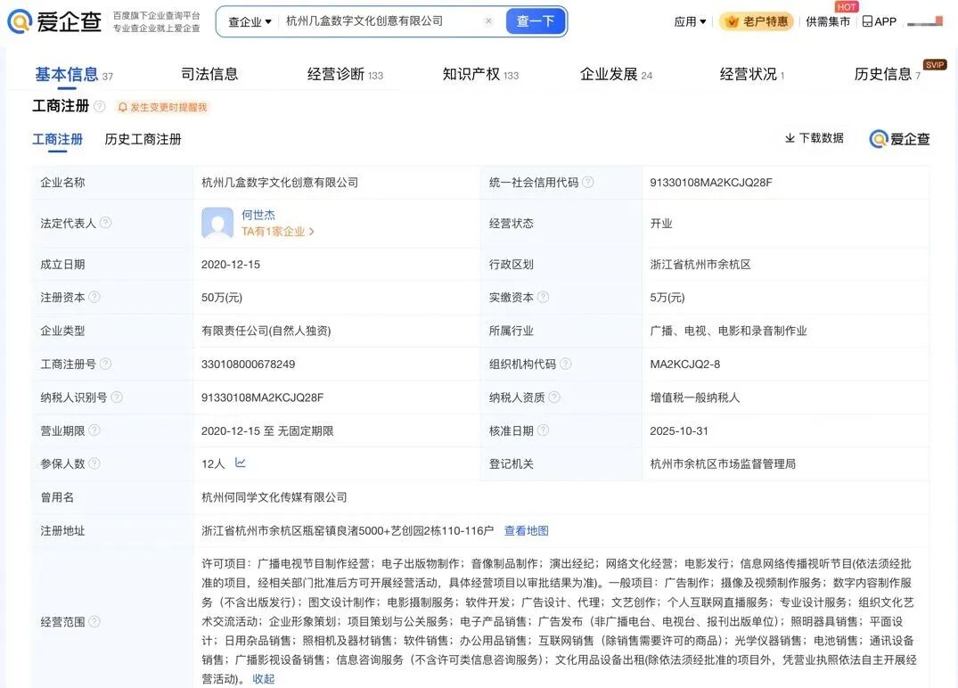 名下的杭州几盒数字文化创意有限公司由他全资持股,经营范围覆盖广播电视节目制作、网络文化经营等多个领域,核心资产就是“何同学”这个IP。