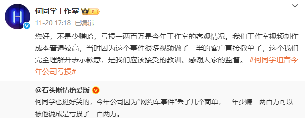 何同学透露到,受事件影响丢了好几单,这直接导致公司年度亏损100-200万。
