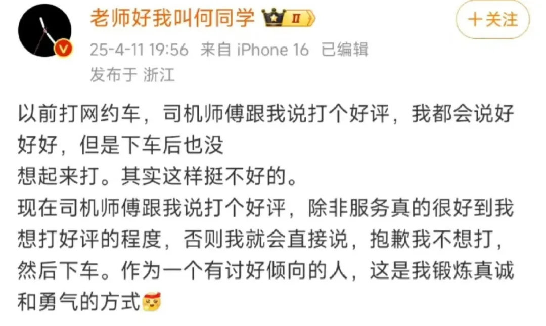 何同学将拒绝司机好评包装成“人格成长”,却忽视了底层劳动者的生存压力,正是这种认知偏差的体现。