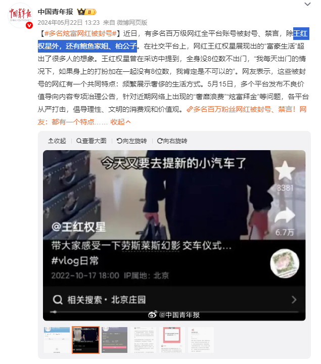 2024年5月,他与王红权星、鲍鱼家姐等多名高调炫富的博主一同被多个社交平台封禁。