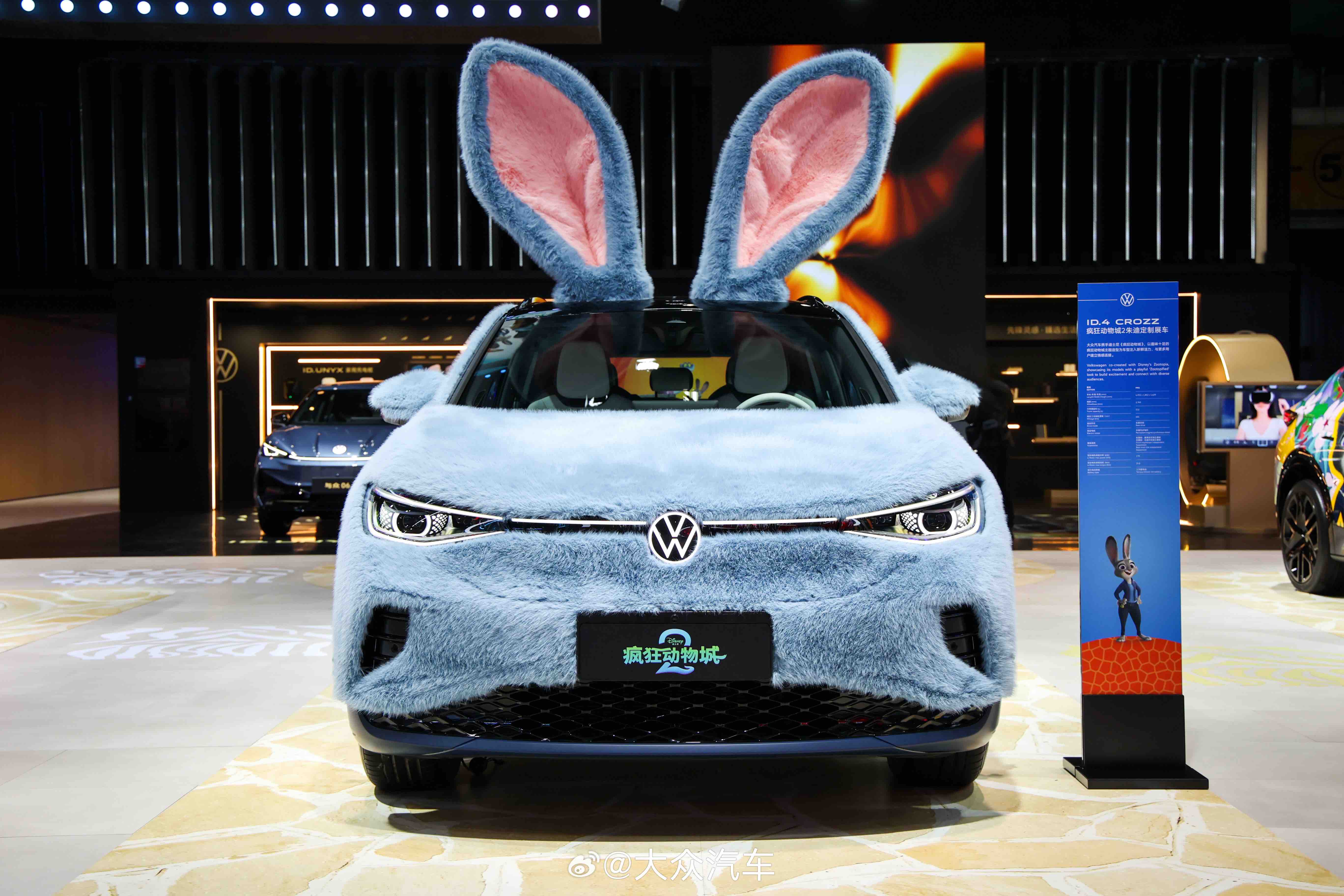 一跨进金标大众的展区,就能看到兔子朱迪、狐狸尼克、树懒闪电这些《疯狂动物城》动画电影的角色。现场分别有穿上“尼克毛衣”与“朱迪毛衣”的与众06,以及一辆黄色的与众06疯狂动物城2定制展车,加上一旁的甜甜圈咖啡吧,众多动画元素给人趣味十足的感觉。