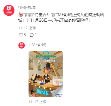 迪士尼官方小红书还很贴心地制作了一个点赞特效,只要点赞海报贴,就可以看到狐尼克和兔朱迪的动效。