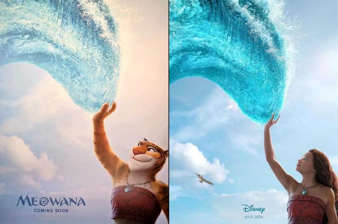 莫阿娜的击掌变成了老虎的击爪,这只老虎还精心穿上了莫阿娜同款小裙子和项链,既复刻了原版精髓,又显得诙谐滑稽。