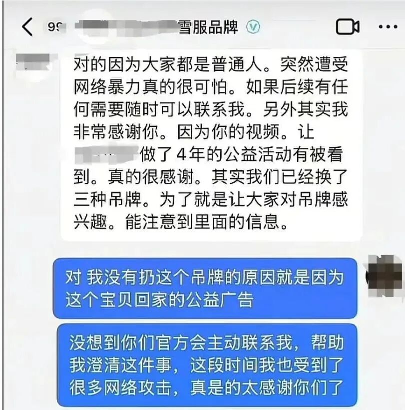品牌负责人孟女士在回应中表示,在品牌成立之初做公益活动,希望消费者带着吊牌滑雪到国内任何一个小山庄和村落,让更多人关注失联儿童,助力宝贝回家。