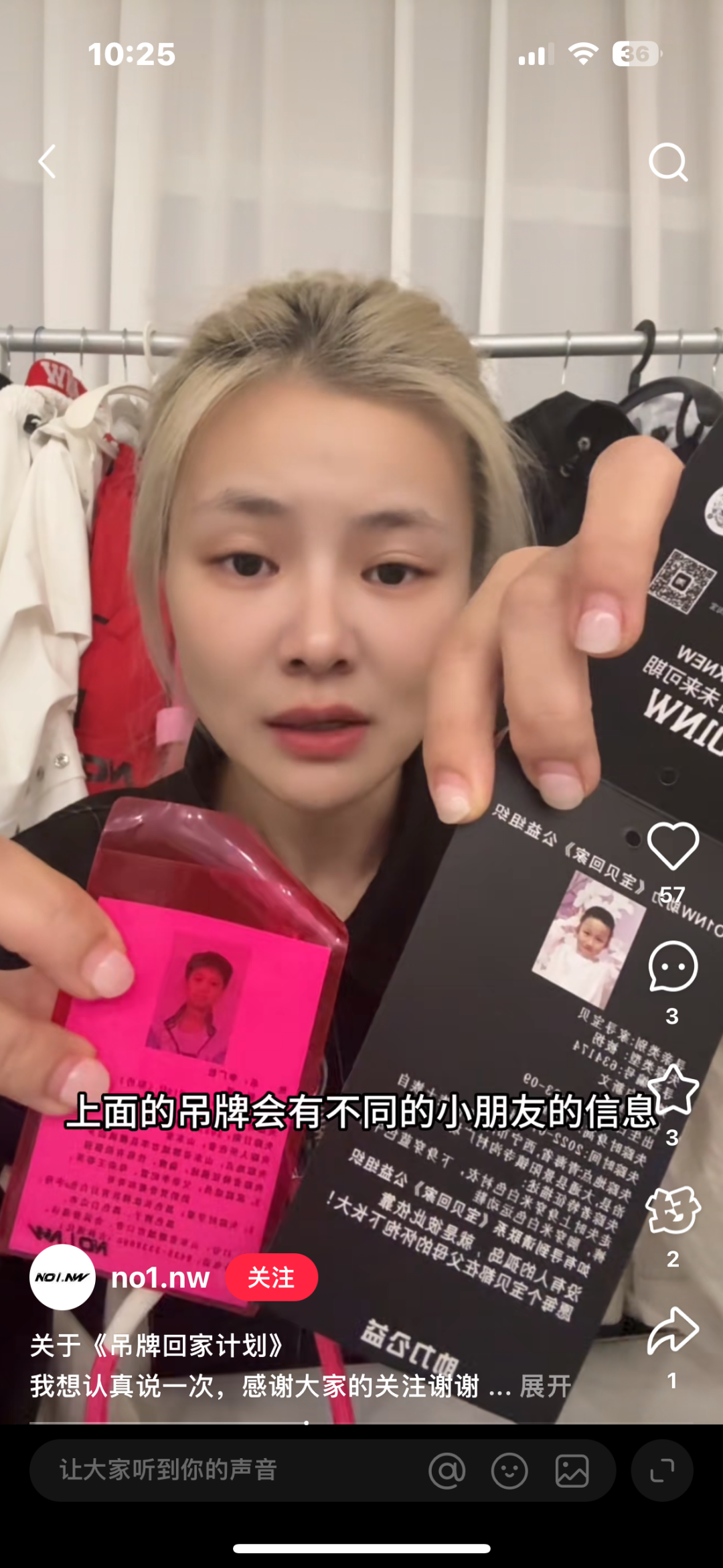 NO1NW负责人孟女士证实,从2019年起品牌就开始在每件衣服上悬挂寻亲吊牌,四年间历经三次升级,从纸质到防水材料,从纯文字到增加二维码。“希望消费者带着这些信息走遍山川湖海,多一份传播就多一份希望。”