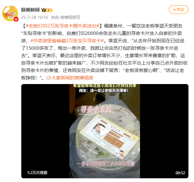 这让我想起了福建泉州的一家餐饮店,老板季蓝天自掏腰包印制失联儿童寻亲卡,放进每一份外卖订单里,一年发了1.5万多张,网友们纷纷称赞“活该他生意好”。