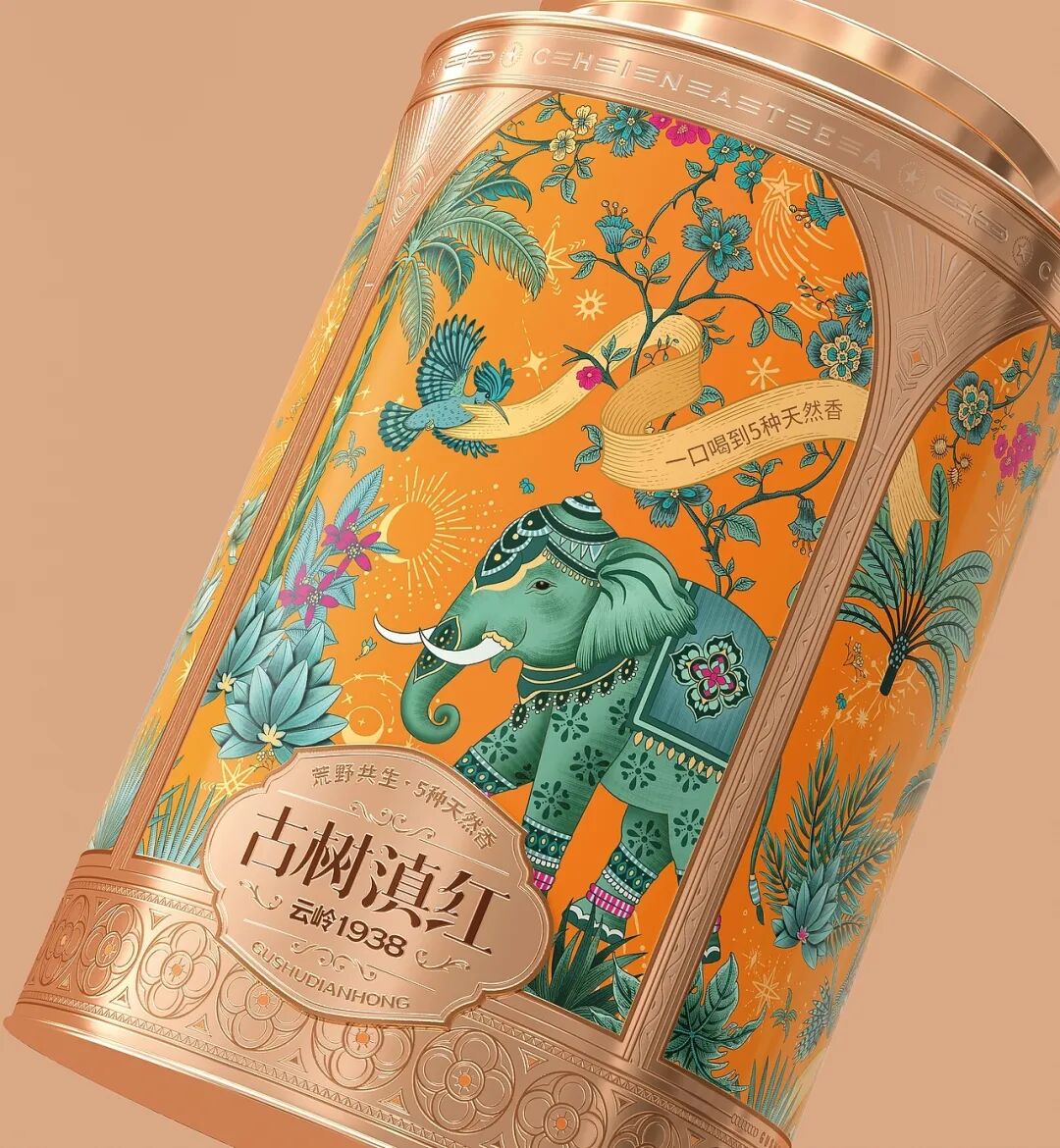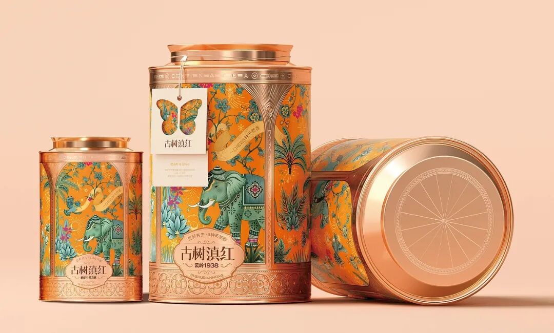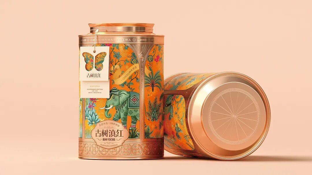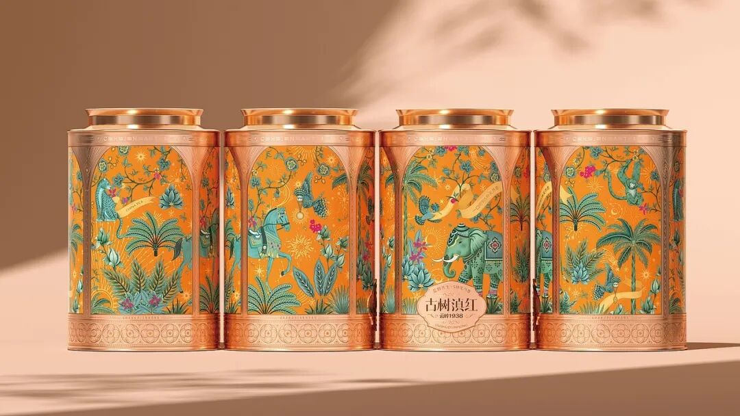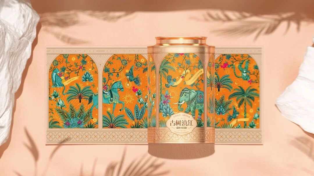 画面中,装饰精美的大象是云南的文化符号,搭配热带植物、飞鸟等元素,构建出荒野共生的生态图景,包装采用的金属质感与华丽纹饰,融合了传统工艺的精致感与现代设计的时尚感,橙色调的热烈运用既抓人眼球,又暗含滇红茶叶的醇厚特质,把云南的地域风情与茶叶的品质属性通过国风美学的创意手法紧密结合,让消费者从视觉上就能感受到古树滇红的独特韵味与文化底蕴。