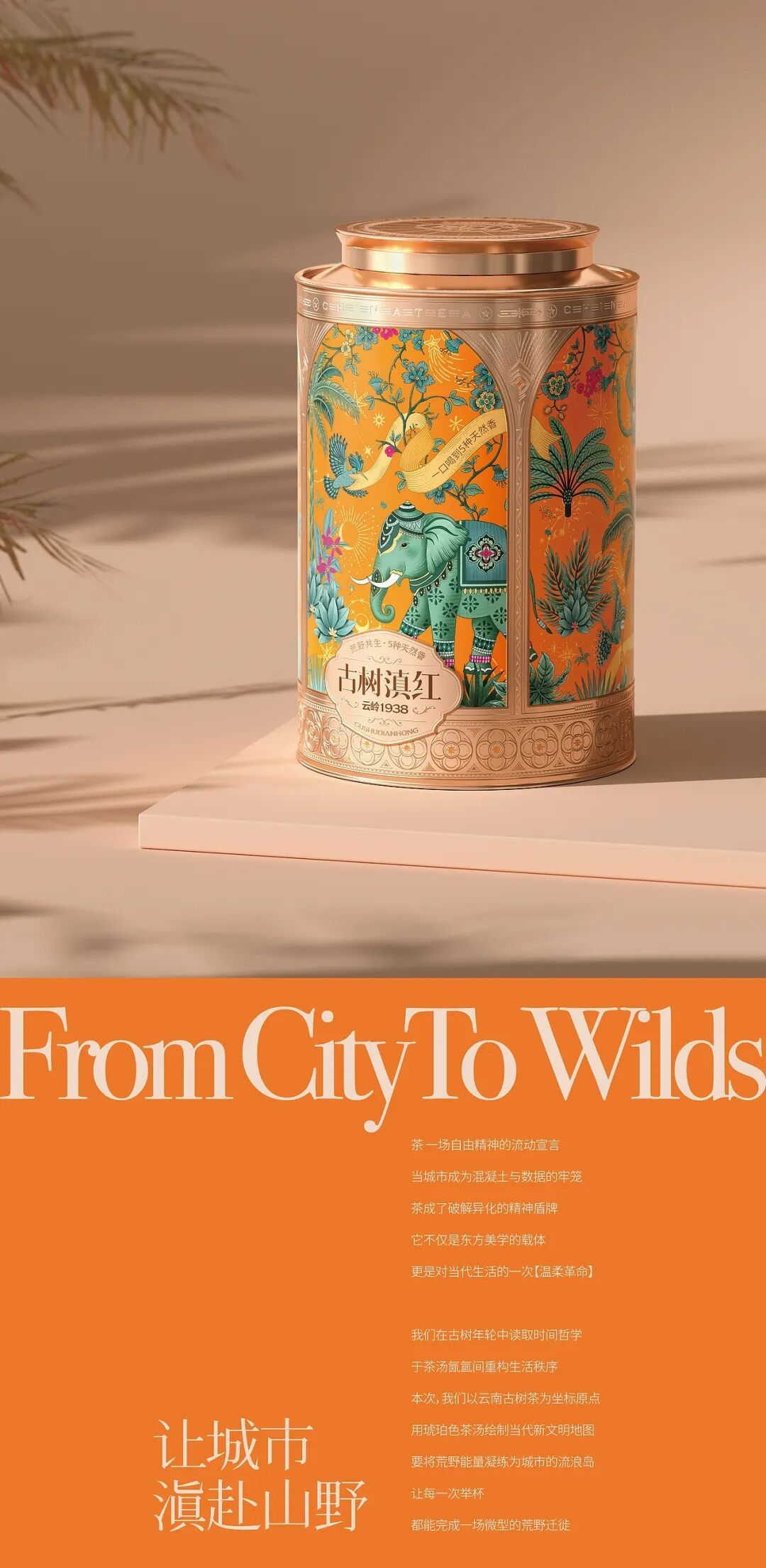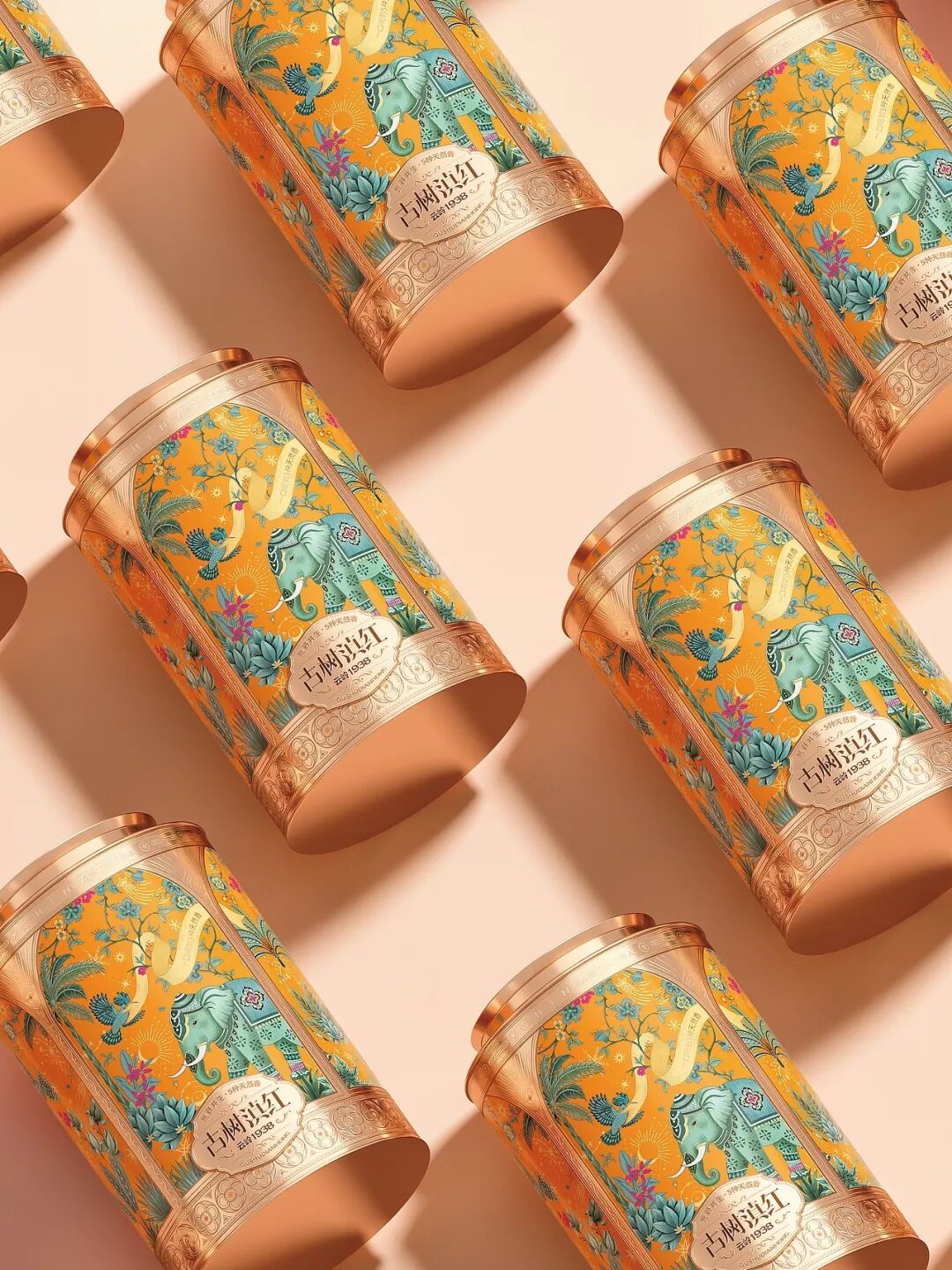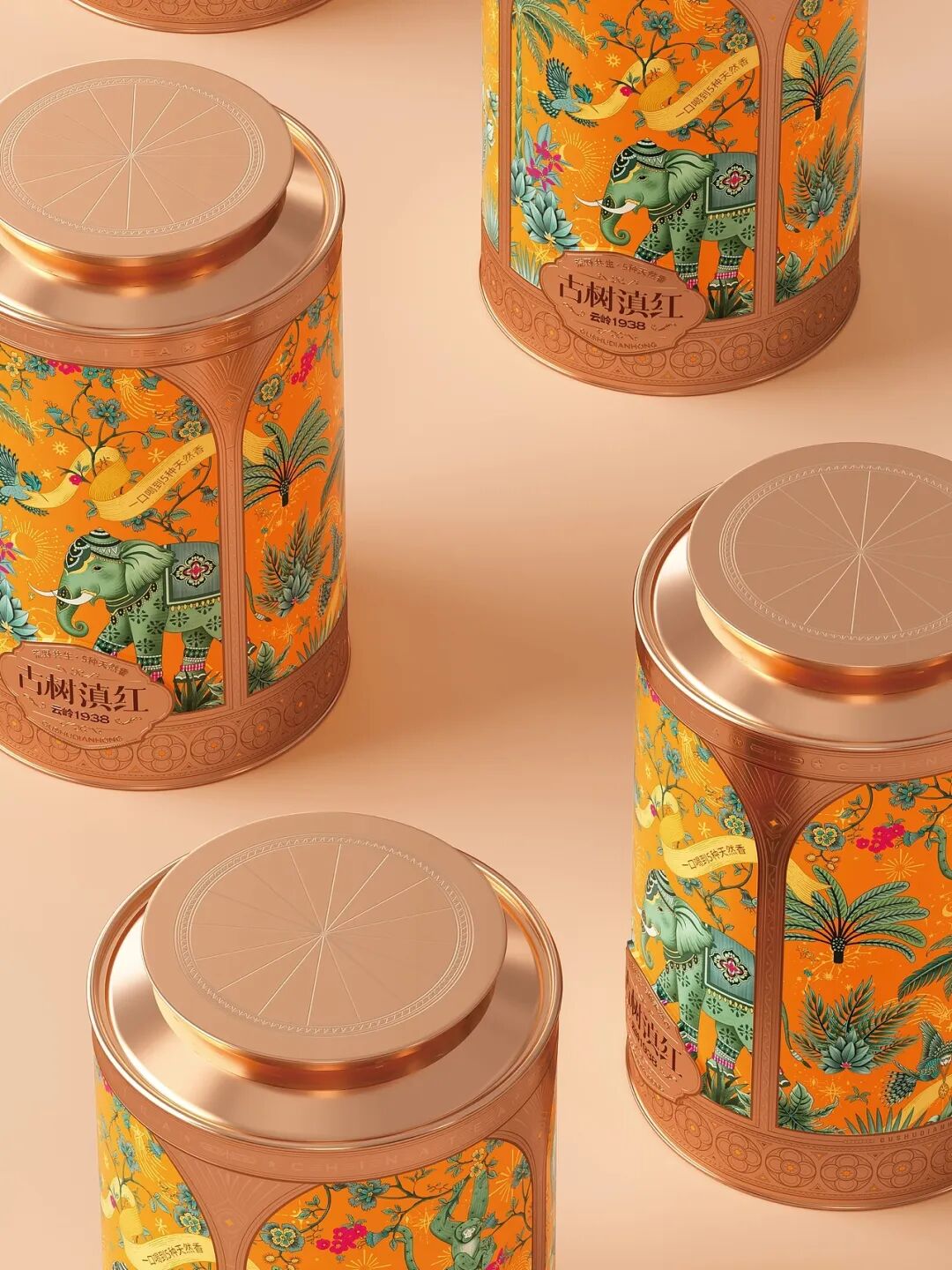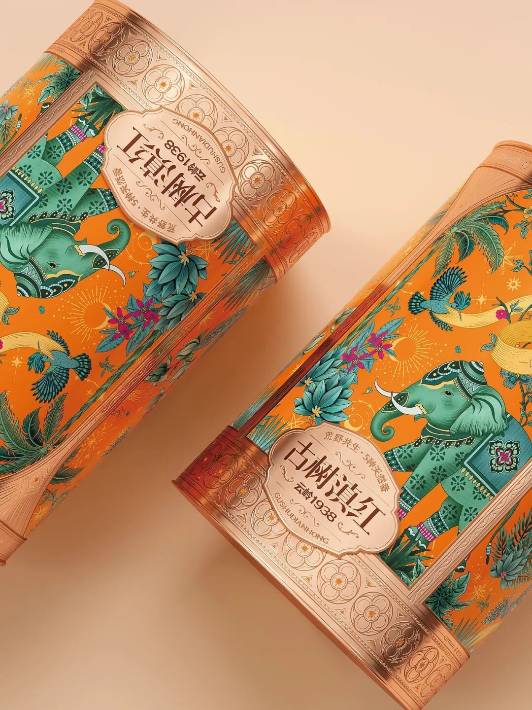 画面中,装饰精美的大象是云南的文化符号,搭配热带植物、飞鸟等元素,构建出荒野共生的生态图景,包装采用的金属质感与华丽纹饰,融合了传统工艺的精致感与现代设计的时尚感,橙色调的热烈运用既抓人眼球,又暗含滇红茶叶的醇厚特质,把云南的地域风情与茶叶的品质属性通过国风美学的创意手法紧密结合,让消费者从视觉上就能感受到古树滇红的独特韵味与文化底蕴。