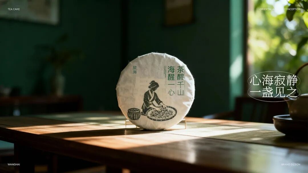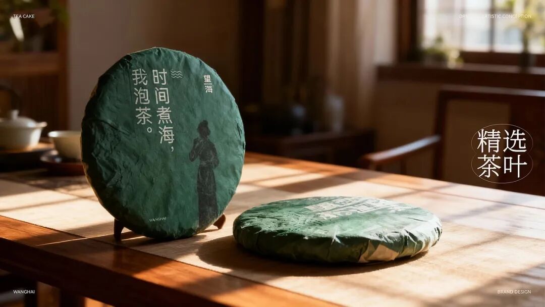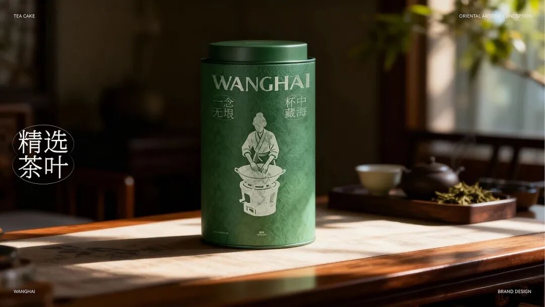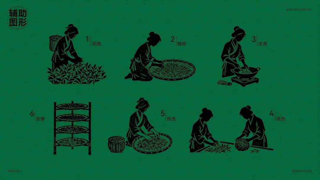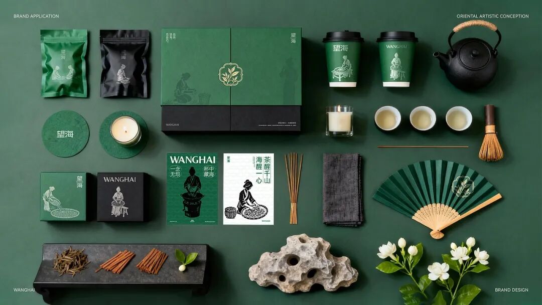 整体用当代设计转译宋代点茶美学,包装以传统制茶工序的剪影为核心视觉元素,将采摘、摊晾、杀青等过程具象化,这是对传统制茶工艺的致敬,也是国风美学中 “尚朴”“重技” 理念的体现。色彩方面,以深绿色为主色调,营造出宁静悠远的东方意境。从茶饼到礼盒,再到周边的茶杯、折扇等品牌应用,整体风格统一,将传统茶文化的雅致与现代设计的简约完美融合,传递出一种 “大繁至简” 的国风审美,让消费者在接触包装的瞬间,就能沉浸到传统茶文化的韵味之中。