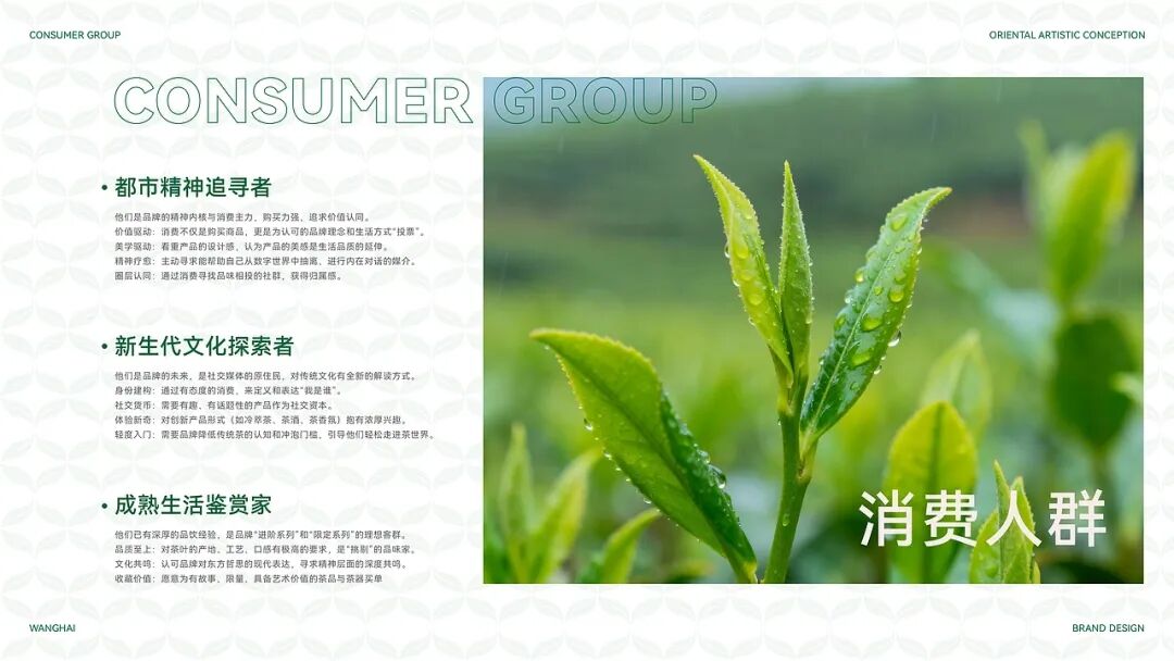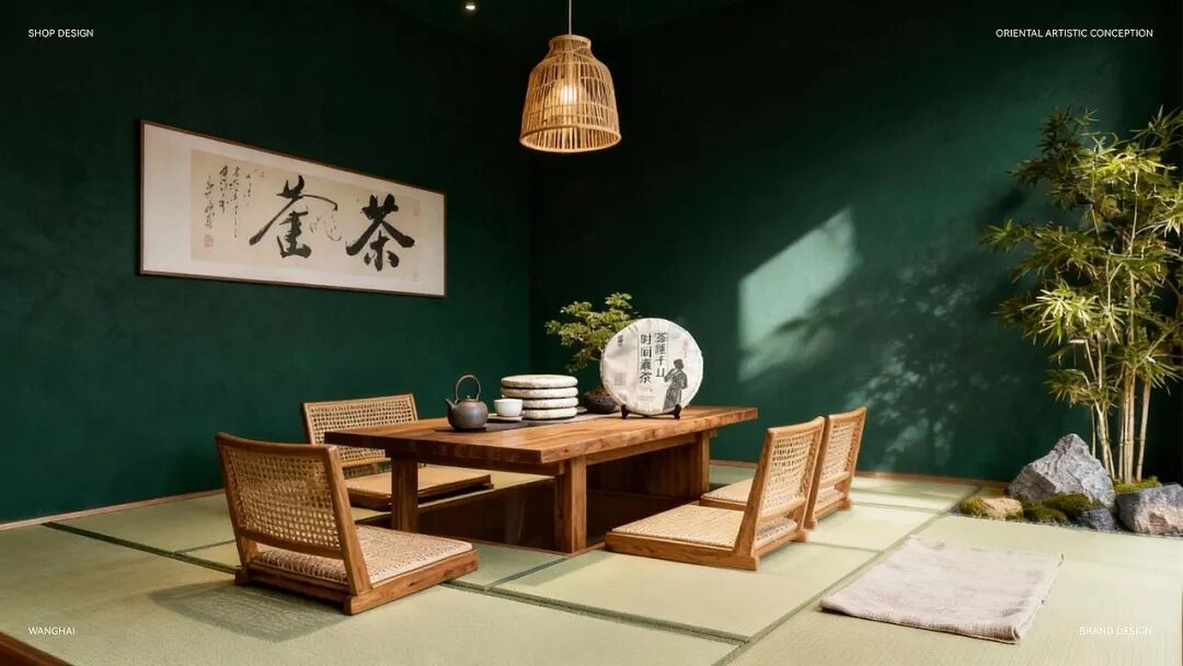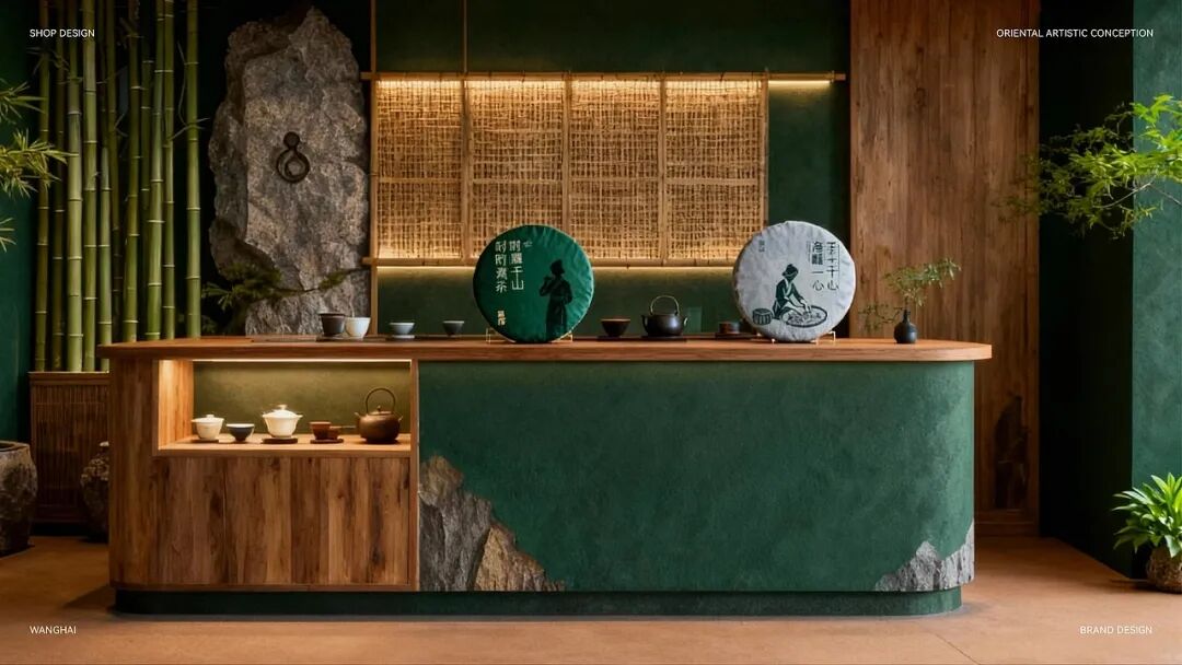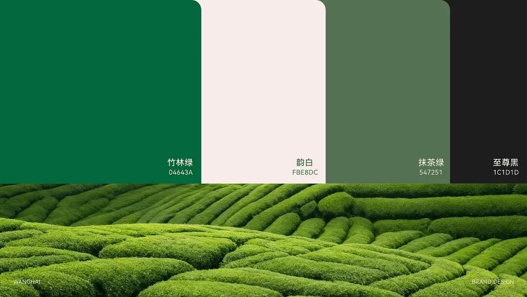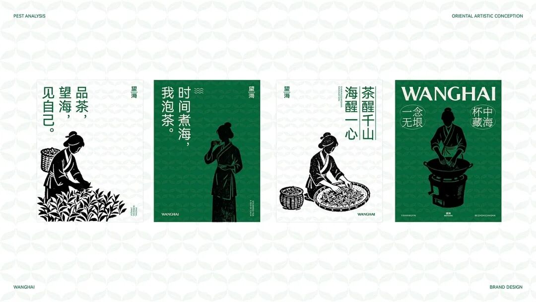 整体用当代设计转译宋代点茶美学,包装以传统制茶工序的剪影为核心视觉元素,将采摘、摊晾、杀青等过程具象化,这是对传统制茶工艺的致敬,也是国风美学中 “尚朴”“重技” 理念的体现。色彩方面,以深绿色为主色调,营造出宁静悠远的东方意境。从茶饼到礼盒,再到周边的茶杯、折扇等品牌应用,整体风格统一,将传统茶文化的雅致与现代设计的简约完美融合,传递出一种 “大繁至简” 的国风审美,让消费者在接触包装的瞬间,就能沉浸到传统茶文化的韵味之中。