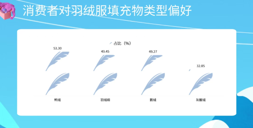 然而,消费偏好数据或许并未完全呼应这种高端方向。iiMedia Research(艾媒咨询)调研数据显示,消费者对填充物的实际偏好更为多元:鸭绒以53.30%的偏好率位列首位,羽绒棉为49.45%,鹅绒则以49.27%的偏好位居第三。