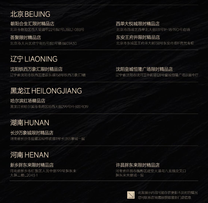 截至目前,高梵在全国共设有10余家线下门店,分布于北京、辽宁、黑龙江、湖南和河南共5个省份/直辖市。其中,北京门店涵盖合生汇、西单大悦城、荟聚、王府井等核心商圈。然而,其在更多一线、新一线城市布局则未见披露,或在一定程度上说明其线下渠道尚未覆盖更多主流消费高地。