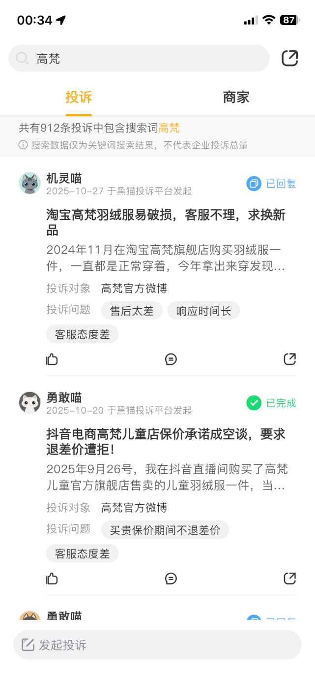 在黑猫投诉平台以“高梵”关键词搜索,页面显示共有912条投诉中包含搜索词“高梵”。事实上,对于试图建立可复购、可信任的高端品牌而言,这类反馈,或可能对品牌的长期溢价能力带来一定影响。