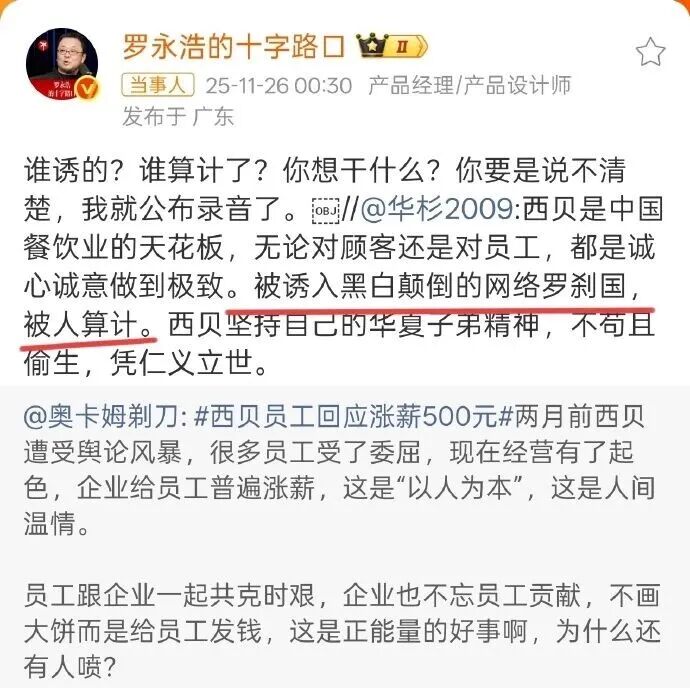 他在社交平台力挺西贝,称其“被诱入网络罗刹国遭人算计”。这条看似普通的声援,却精准踩中了罗永浩的雷区。