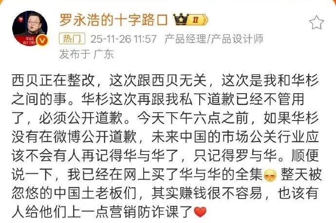 他进一步放狠话:“私下道歉已经没用了,不公开认错,未来中国公关行业只会记得罗与华,忘了华与华”。