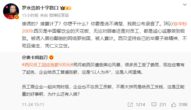 早在9月那次交锋时,华杉就曾跳出来直言罗永浩是“污蔑”,并声称贾国龙“要硬杠网络黑嘴”。