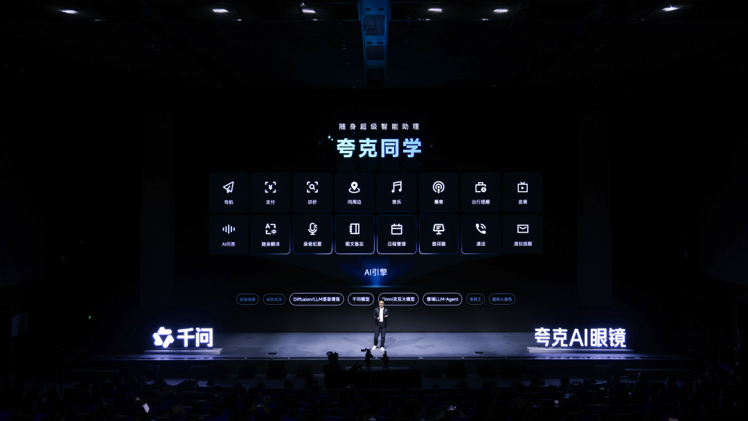 结合10天前阿里千问公测,这场夸克AI眼镜发布会实际上是整个阿里AI to C动作的延续。从发布会布展就能看到,主会台左右两边分列着醒目的千问与夸克AI眼镜的LOGO。