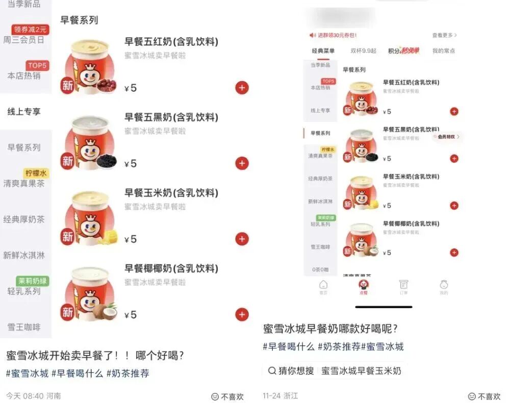 问卷还热乎着呢,蜜雪冰城已经在大连、西安、南宁、杭州四个城市悄悄上线了早餐奶,跟搞地下工作似的。