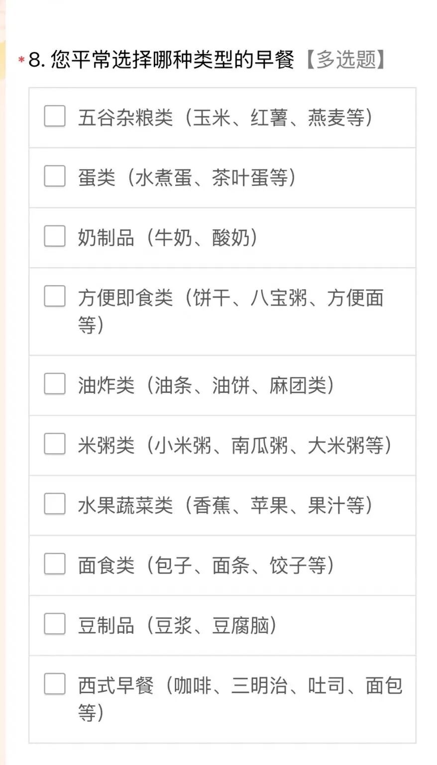 我仔细研究了下这份问卷,它不仅问你喜欢吃中式还是西式早餐,还问你通常在哪里买早餐,花多少钱。