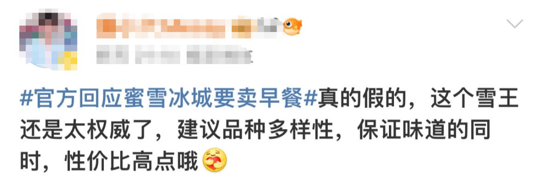 这很能代表大多数消费者的想法。社交平台上,面对雪王出早餐的消息,不少人就呼吁,品种可以多一点,向麦当劳、肯德基早餐看齐。