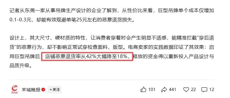 《羊城晚报》报道称,有商家使用巨型吊牌后,线上恶意退货率从42% 直接降到18%。