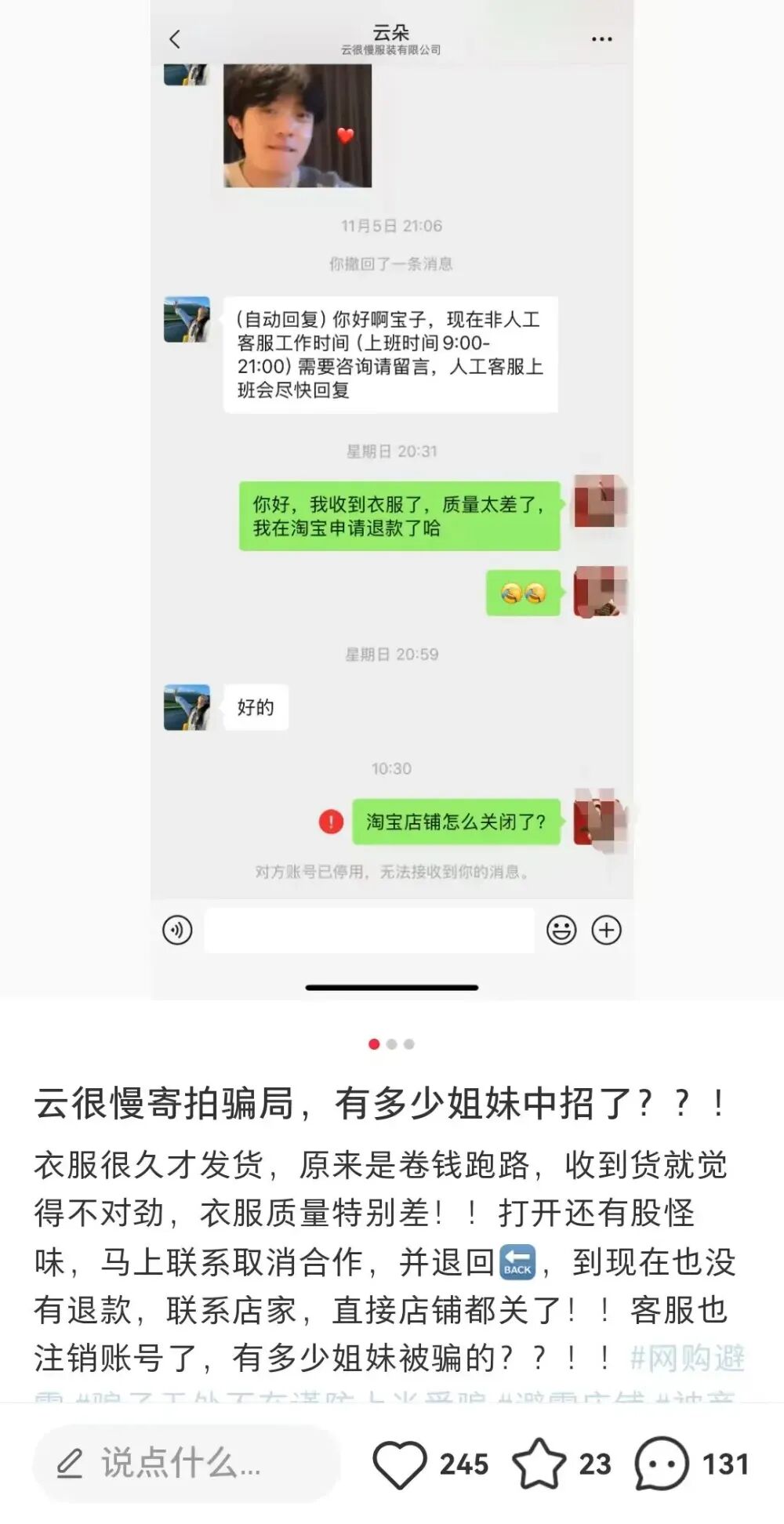 但就是这样一个“强者生存”的行业里,一家坐拥131万粉丝、在淘宝女装混得风生水起的店铺“云很慢”,却突然跑路了。