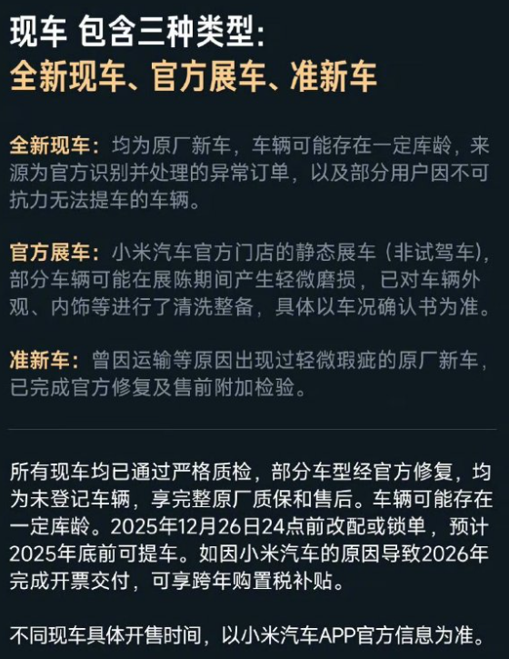 雷军表示:现车包含全新现车、官方展车、准新车,已通过严格质检,可享快速提车、完整原厂质保和售后,部分车型可享优惠。官方展车和准新车等都是经官方修复的新车。