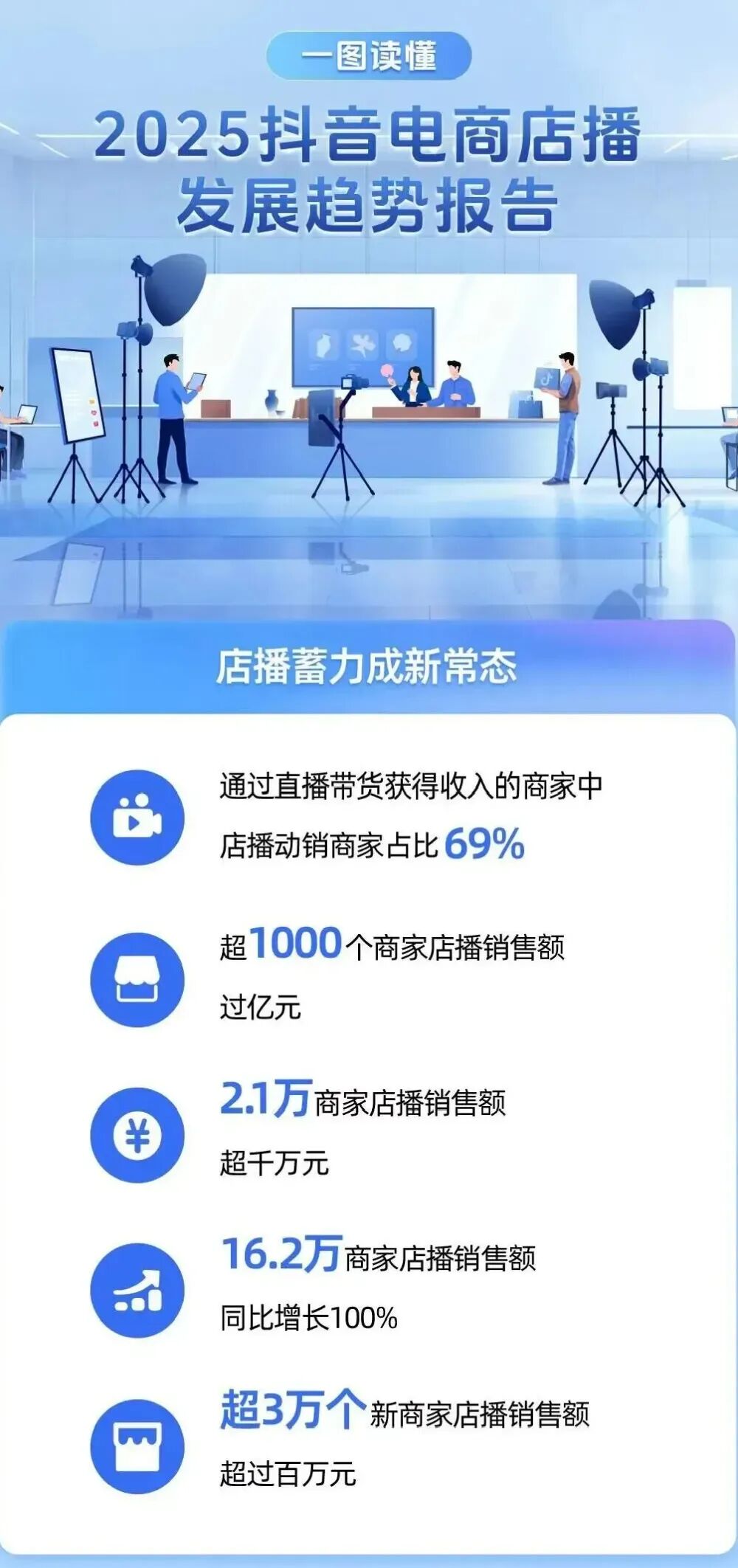 抖音上,超过69%的带货商家都选择做店播,品牌自播数量同比直接翻倍涨113%,超过1000家商家靠店播卖出一个亿,2.1万家破千万。