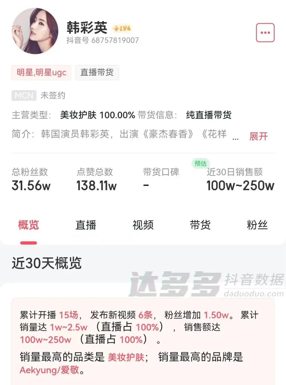 数据显示,韩彩英近30天开播15场,销售额约100万—250万。
