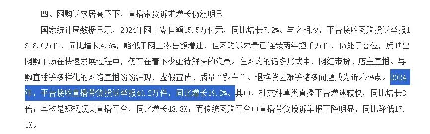 数据显示,2024年,全国市场监管部门共接收直播带货投诉举报40.2万件,同比增长19.3%。