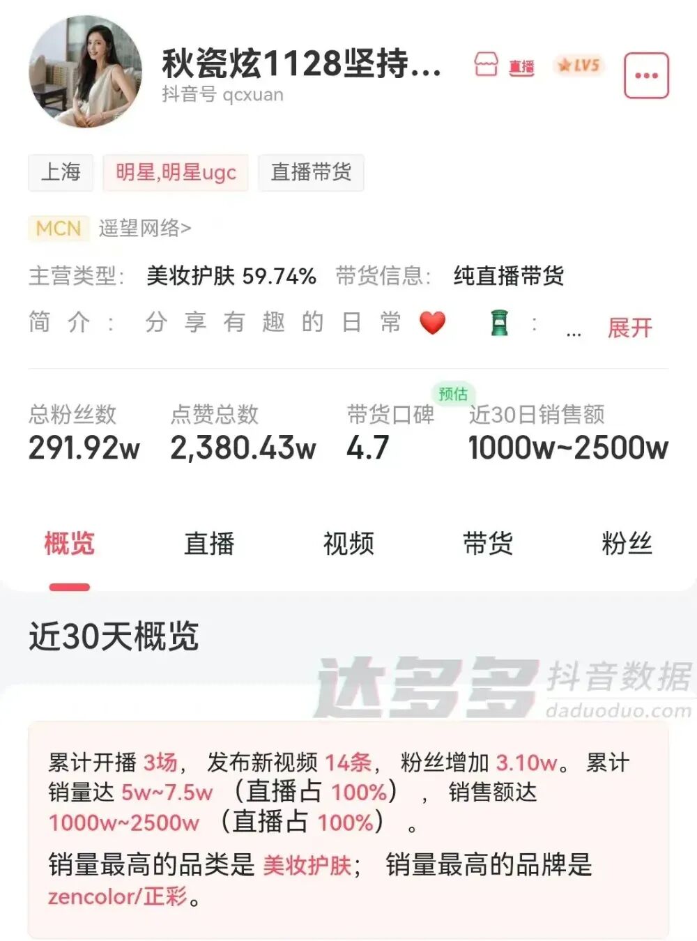 数据显示,过去30天,她只开播了两场,销售额约10万—25万,主要品类集中在美妆护肤。