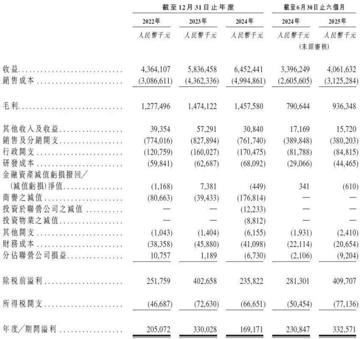 根据招股书,2022年至2025年上半年,潮宏基分别实现约43.64亿元、58.36亿元、64.52亿元和40.62亿元的营收,仅2025年上半年,净利润达3.33亿元。