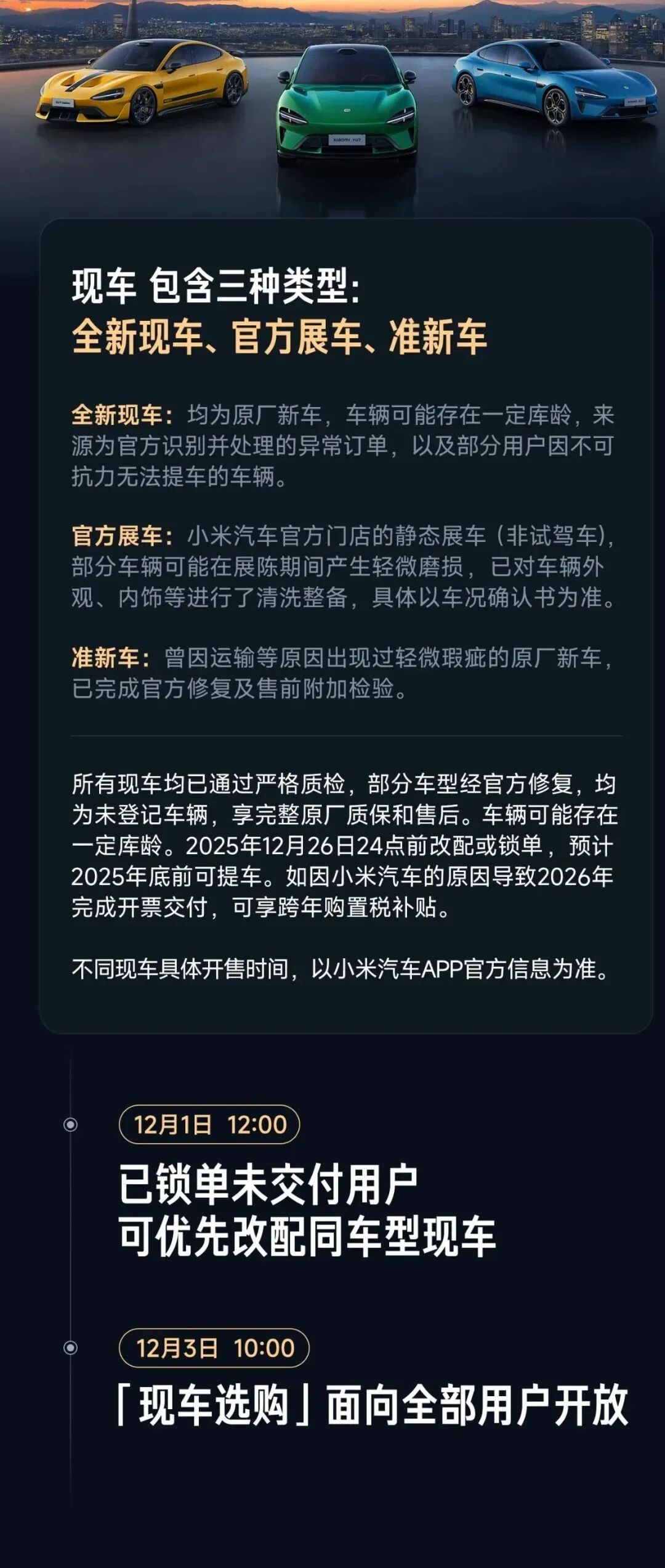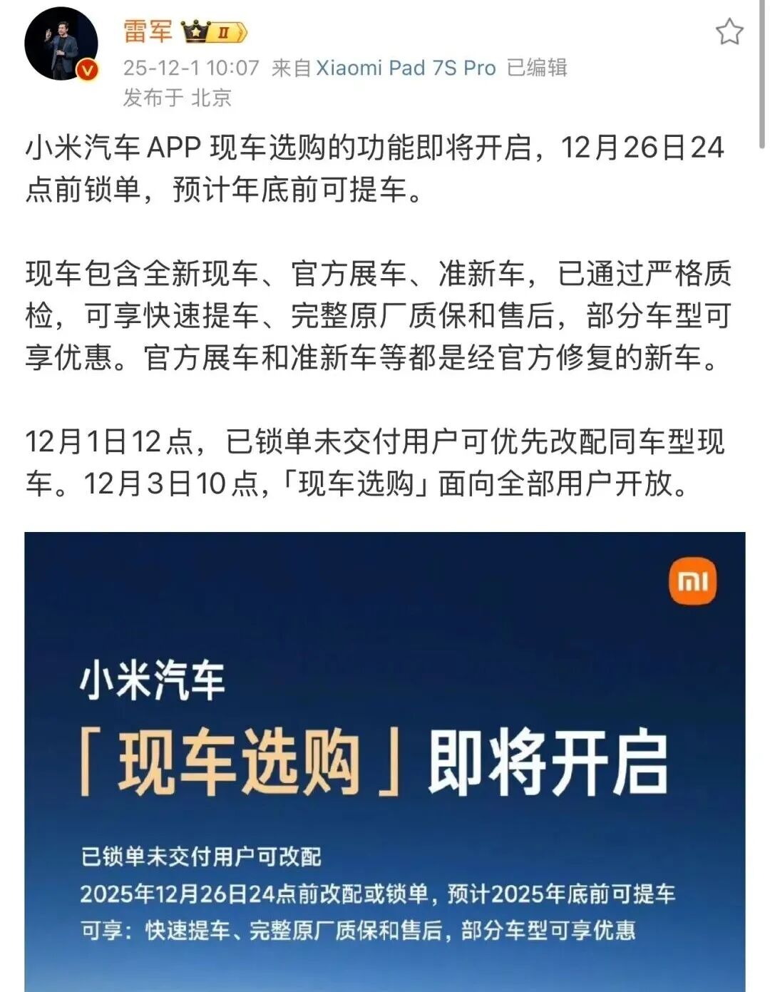 “12月26日前锁单,年底前提车!”12月1日,雷军在社交媒体上宣布小米汽车APP将开启现车选购。