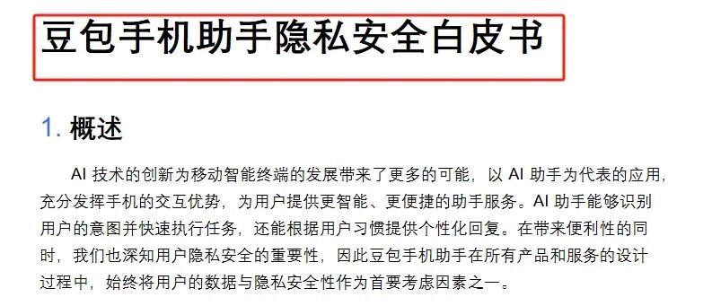 这是所有AI产品都绕不开的坎。目前豆包已经提前做好了“隐私防护”——发布了《豆包手机助手隐私安全白皮书》。