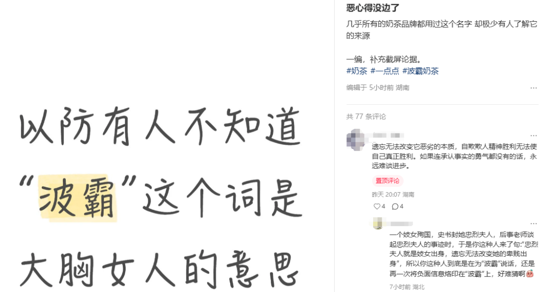 理由是,在广东粤语地区,“波霸”本就是特指大胸女生的俚语,自带浓厚的性别凝视意味,用在奶茶小料上,本质是对女性的不尊重。