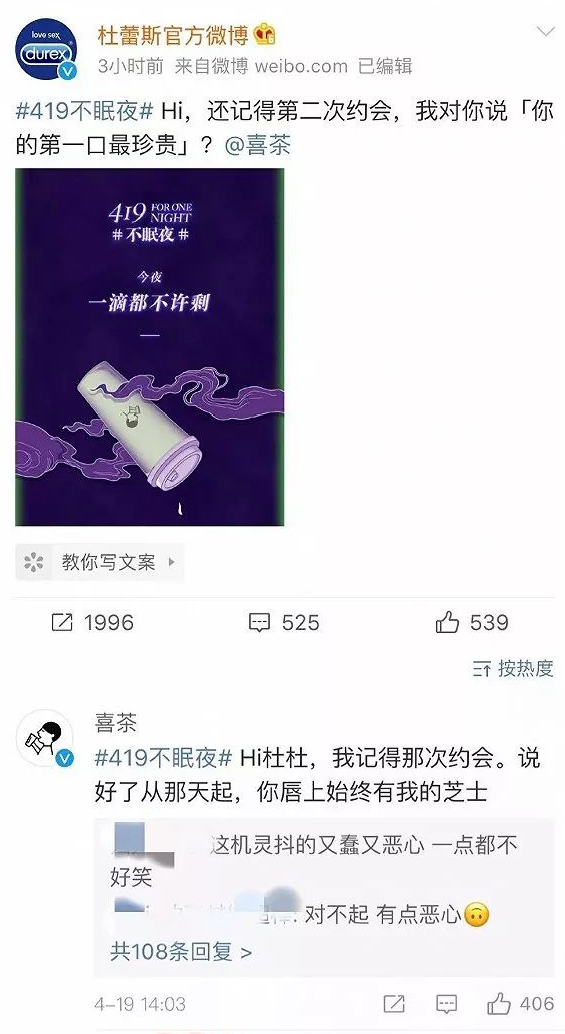 2019年喜茶和杜蕾斯联名,评论区互动文案“你唇上有我的芝士”被指暗示性太强,直接引发网友反感;