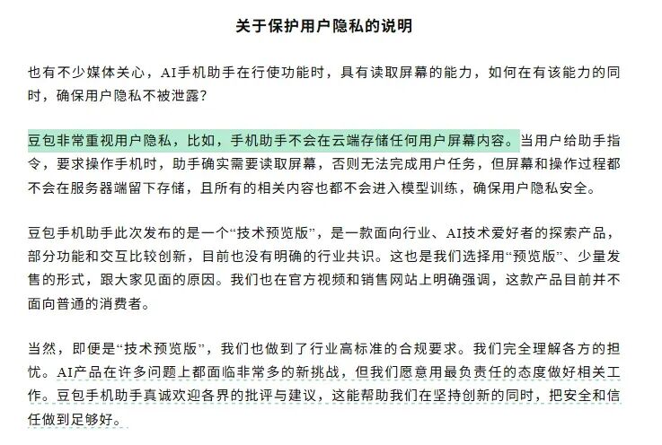 值得一提的是,就在昨晚,豆包手机助手官方公众号发布了一篇长文,专门回应公众关切的几个问题。