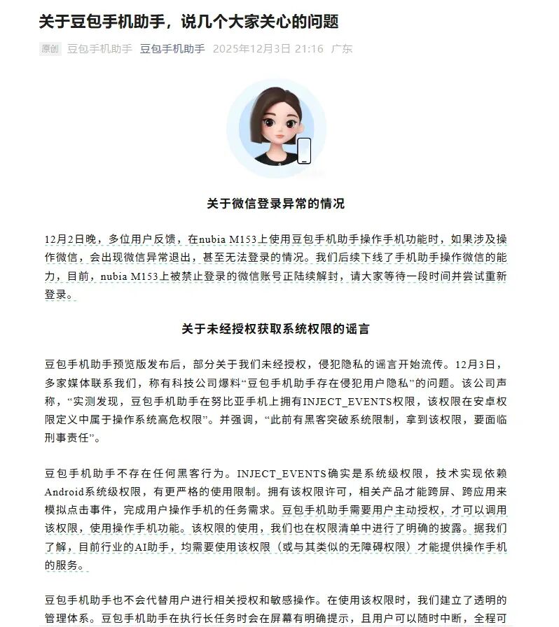 随着争议的发酵,豆包手机助手团队迅速做出了回应——