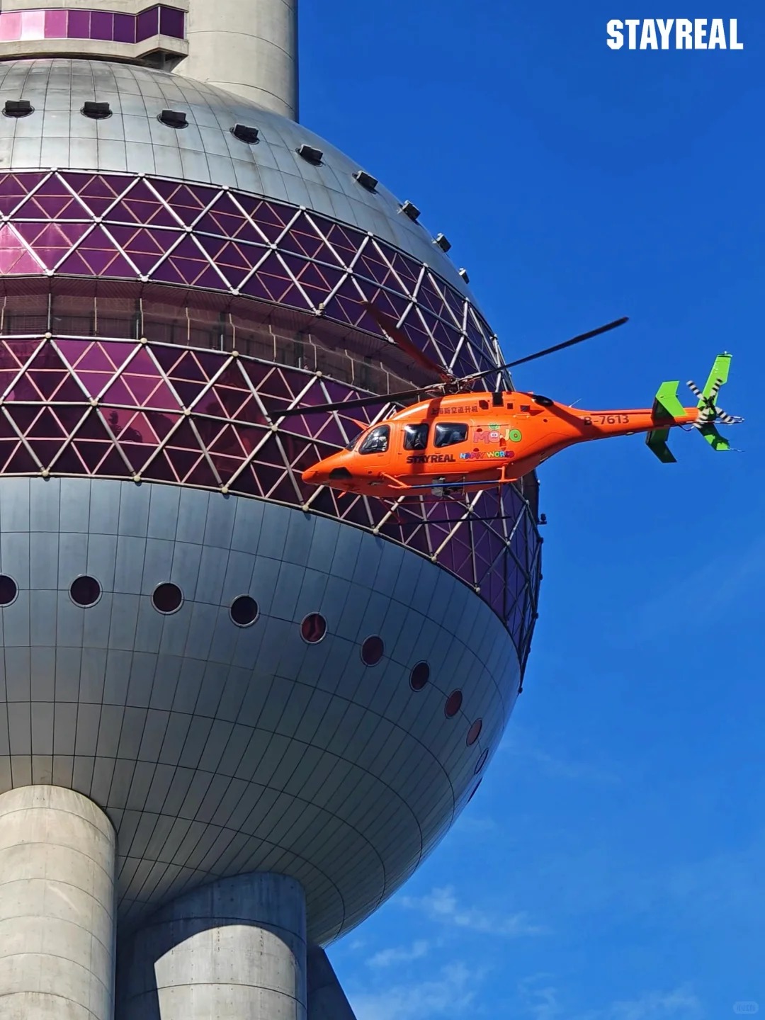 活动当日印有STAYREAL「MOJO HAPPY WORLD」专属皮肤的直升机环绕上海陆家嘴天际线,形成一道贯穿摩天楼宇的橙色风景,开启11月「生日巡礼」同庆东方明珠塔和卜卜生日。从黄浦江畔起飞,穿越城市上空,最终盘旋于东方明珠前,以“快乐空降”的具象化形式拉开活动序幕。